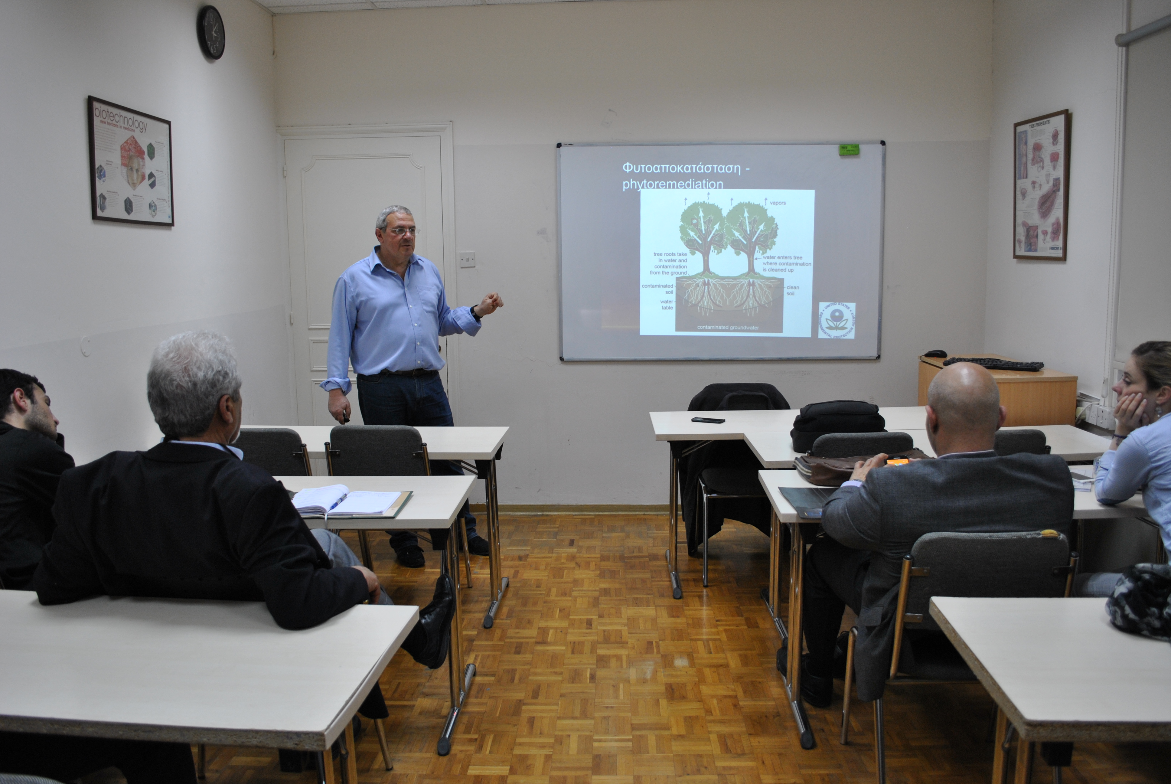 Ο κ. Θεοπέμπτου παρέθεσε διάλεξη με θέμα «Τεχνολογίες και Μεθοδολογίες Απορρύπανσης» όπου ανέλυσε θέματα σχετικά με τη βιοεξυγίανση εδαφών και υδάτων, τις τεχνολογίες απορρύπανσης και την αντιμετώπιση έκτακτων περιβαλλοντικών συμβάντων. Εξέθεσε πολλά παραδείγματα για την πλήρη κατανόηση των θεμάτων και υπήρξε δημιουργικός διάλογος με τους φοιτητές του KES College.