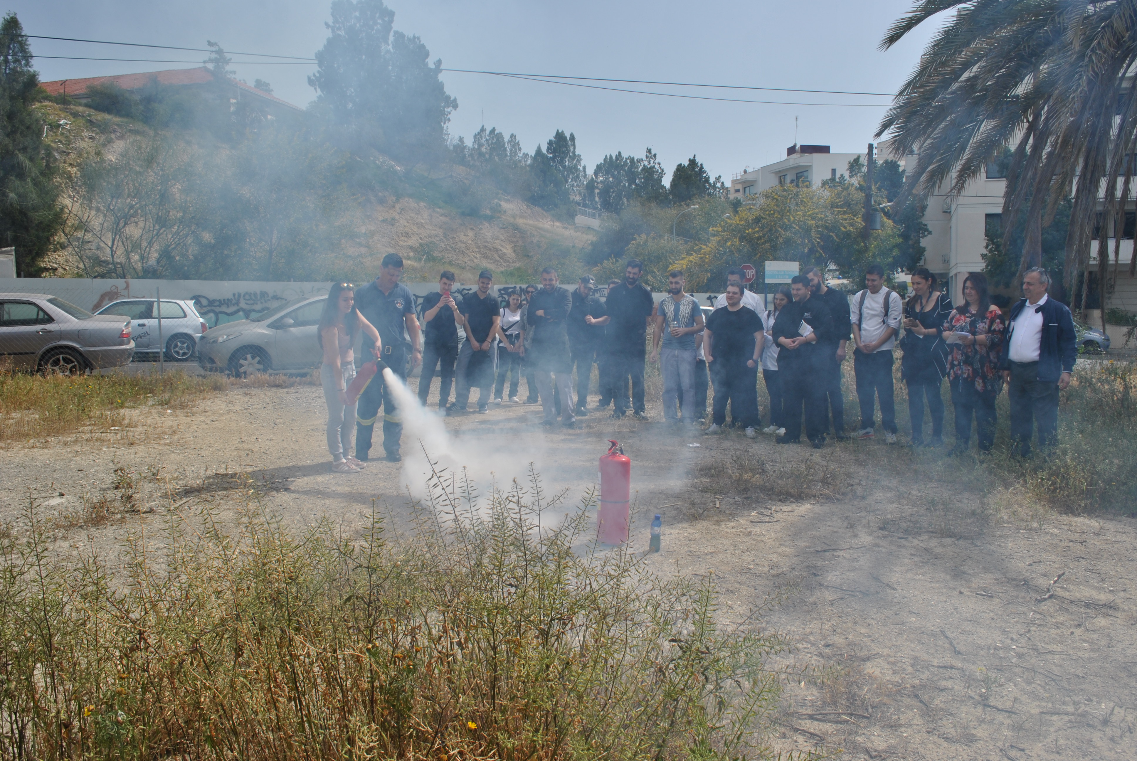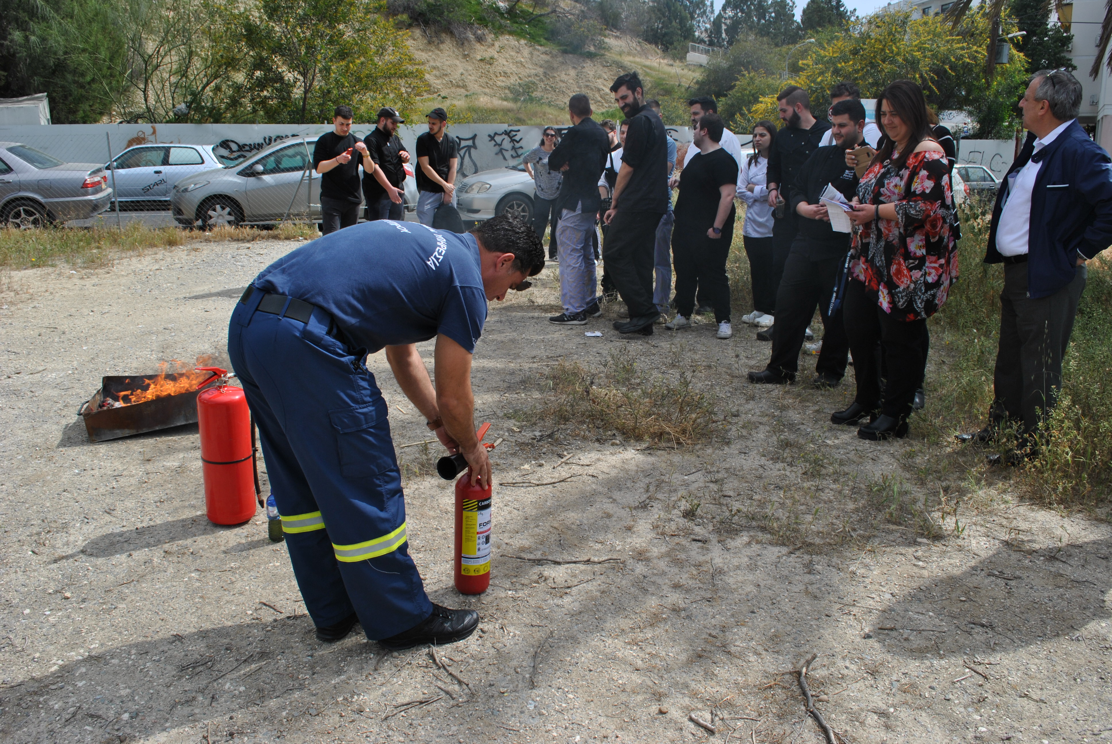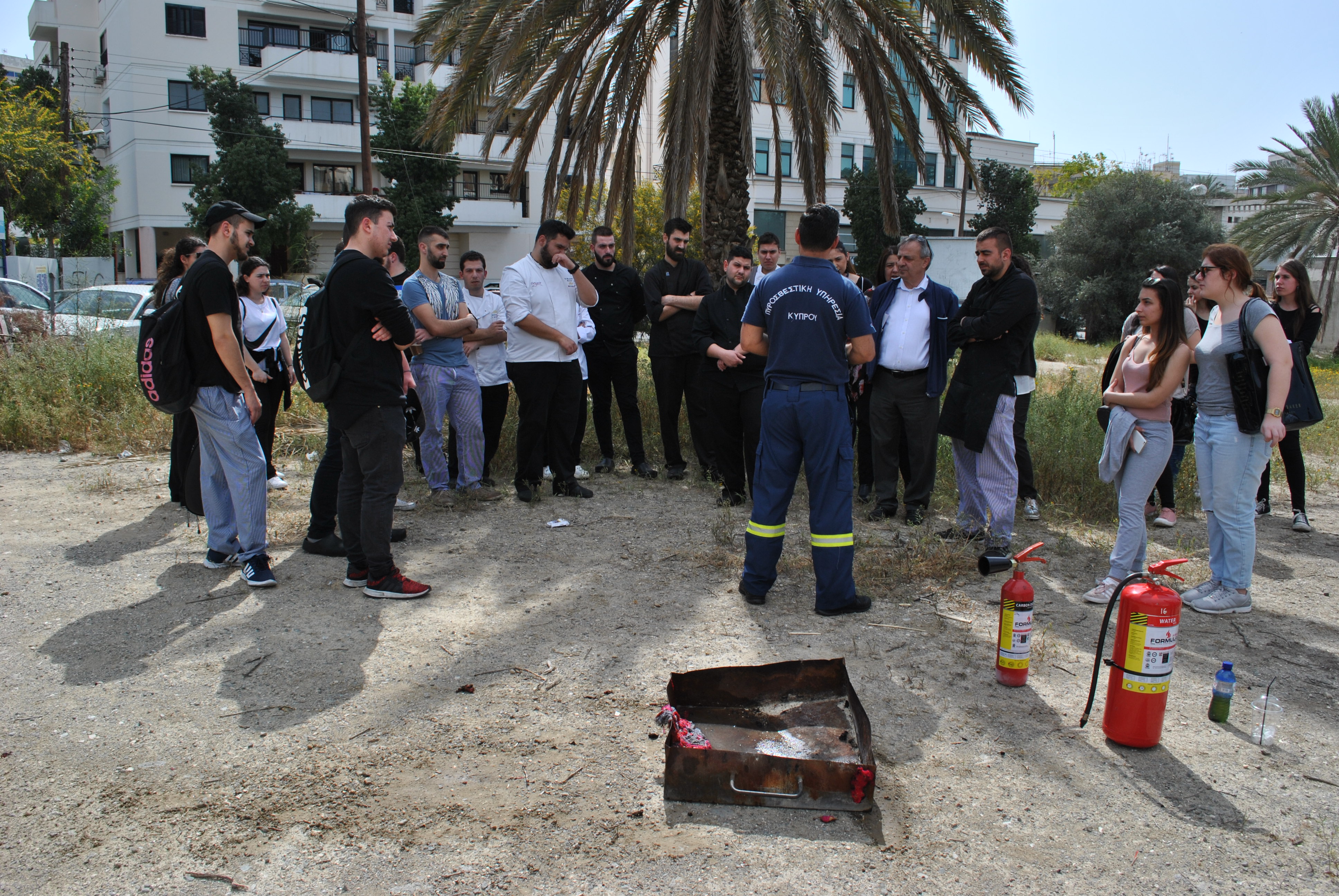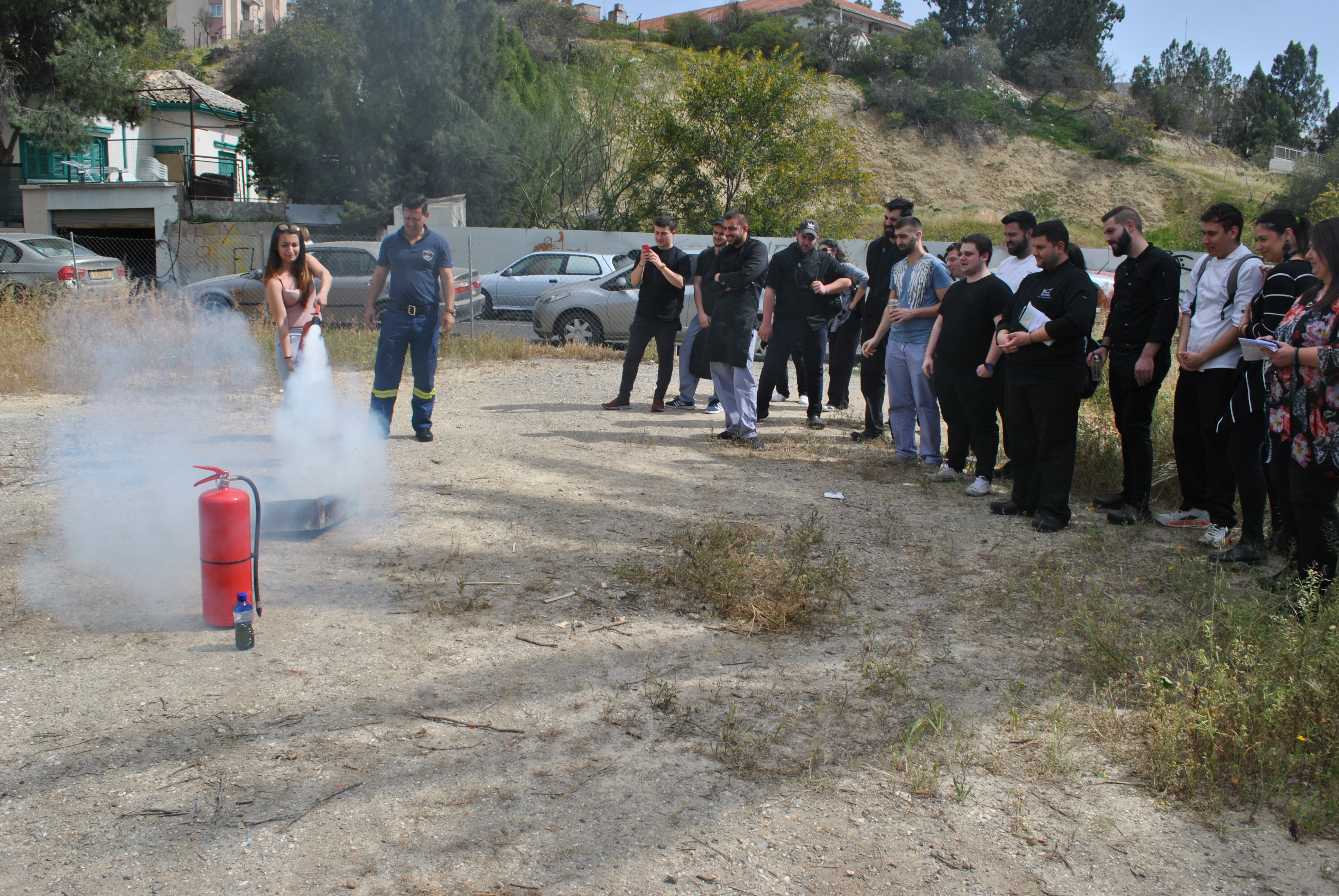 Πέραν της θεωρίας, ακολούθησε πρακτική άσκηση όπου ο κ. Τύλληρος παρουσίασε στους φοιτητές τη χρήση και τα είδη (διοξειδίου του άνθρακα και νερού ) των πυροσβεστήρων στην πράξη και σε ποια απόσταση πρέπει να βρίσκονται από τη φωτιά για να την κατασβήσουν αποτελεσματικά.