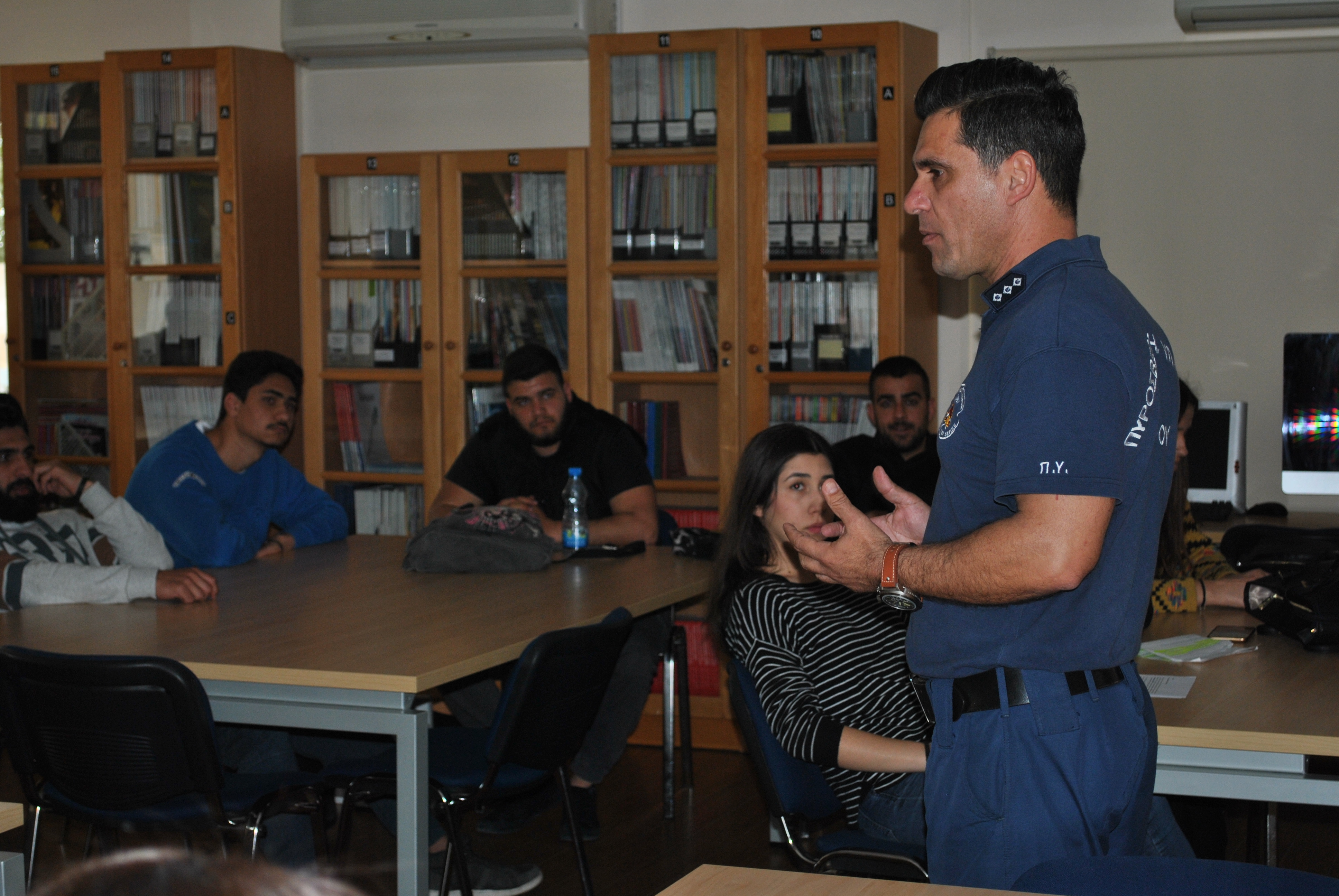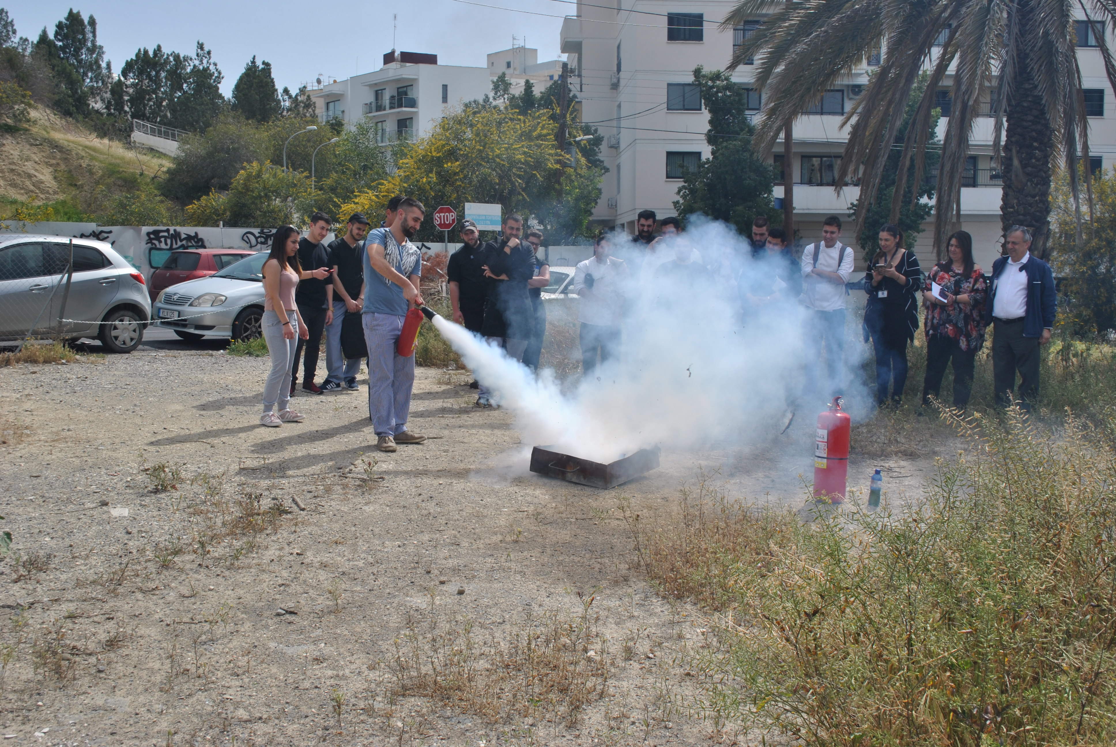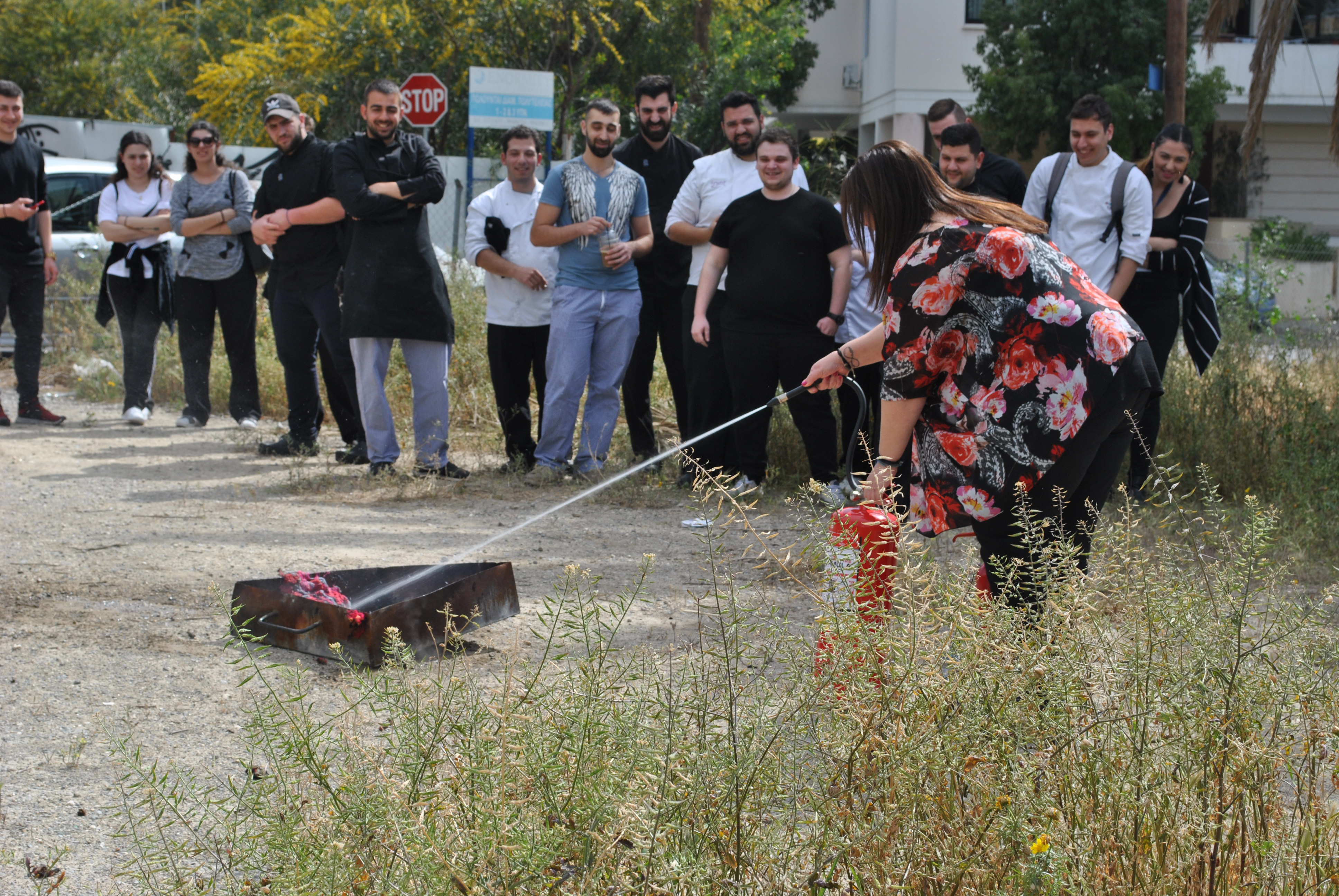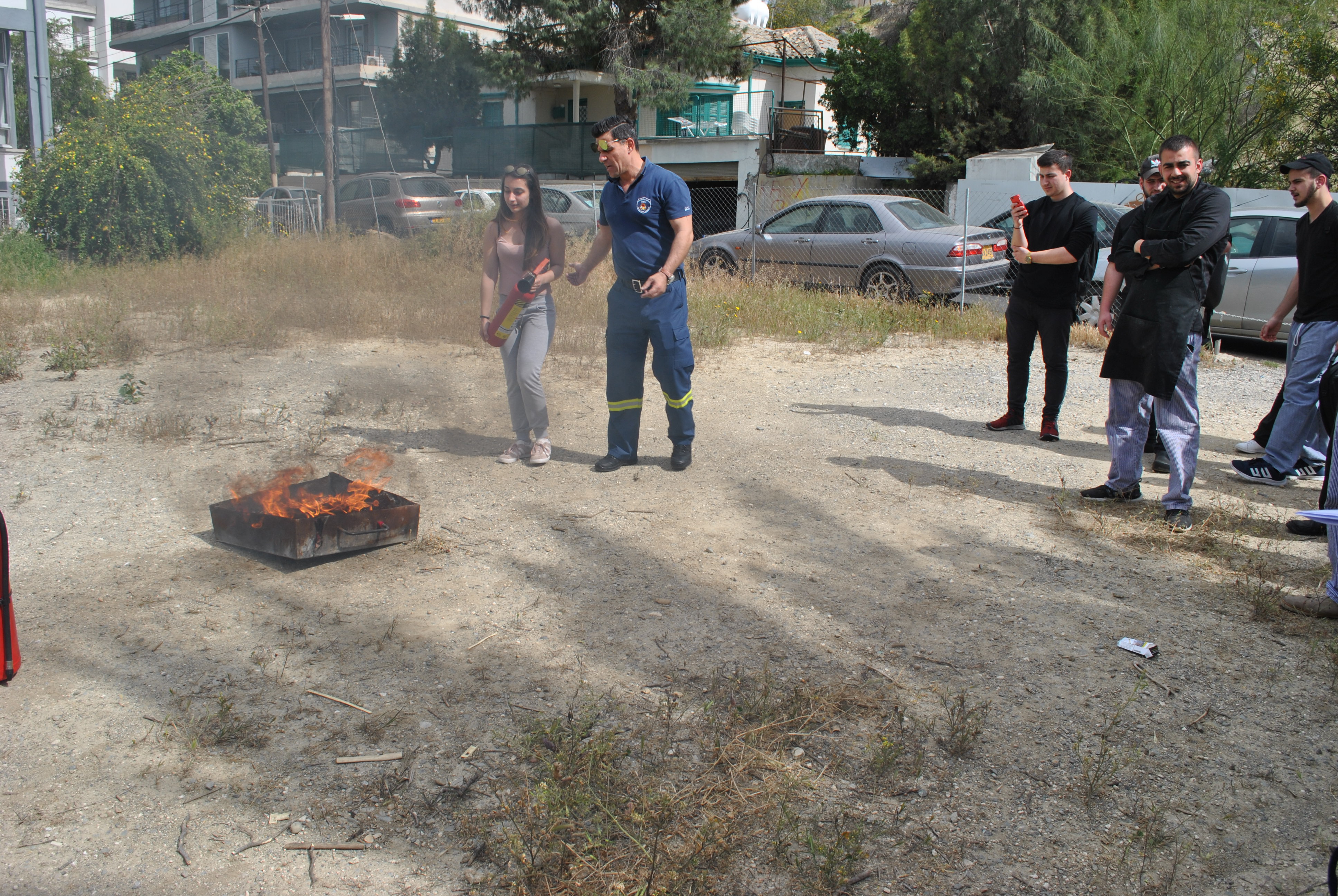 Πέραν της θεωρίας, ακολούθησε πρακτική άσκηση όπου ο κ. Τύλληρος παρουσίασε στους φοιτητές τη χρήση και τα είδη (διοξειδίου του άνθρακα και νερού ) των πυροσβεστήρων στην πράξη και σε ποια απόσταση πρέπει να βρίσκονται από τη φωτιά για να την κατασβήσουν αποτελεσματικά.
