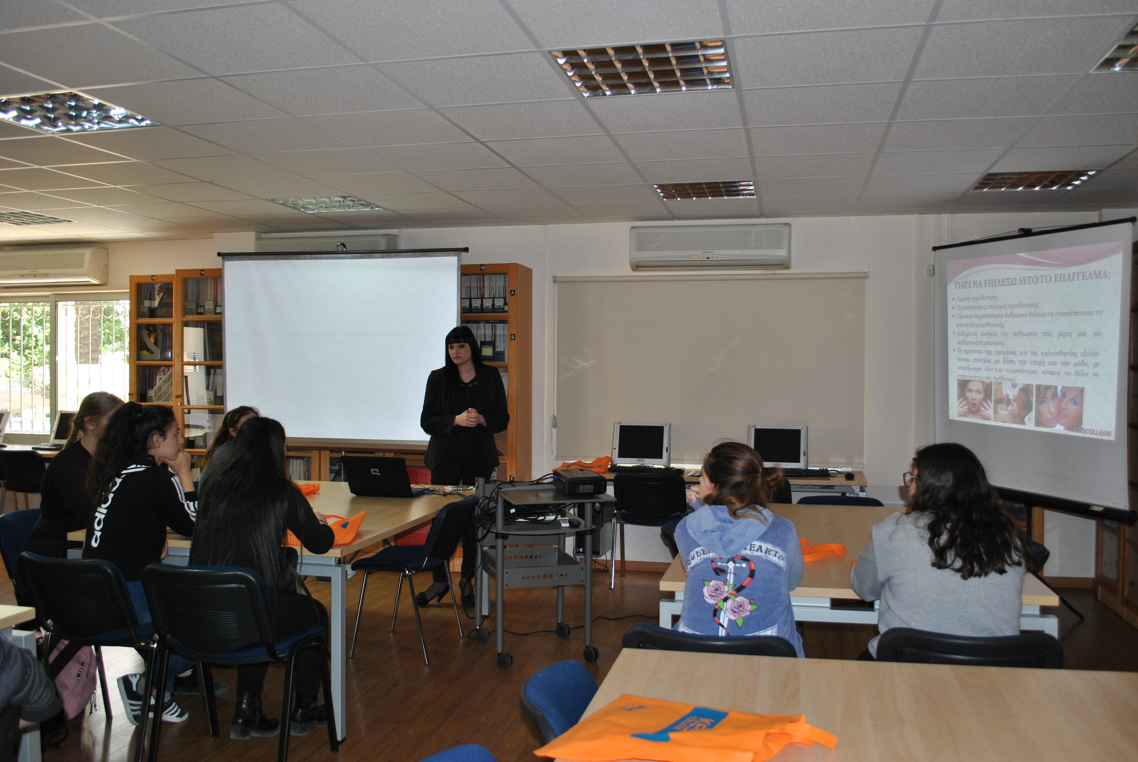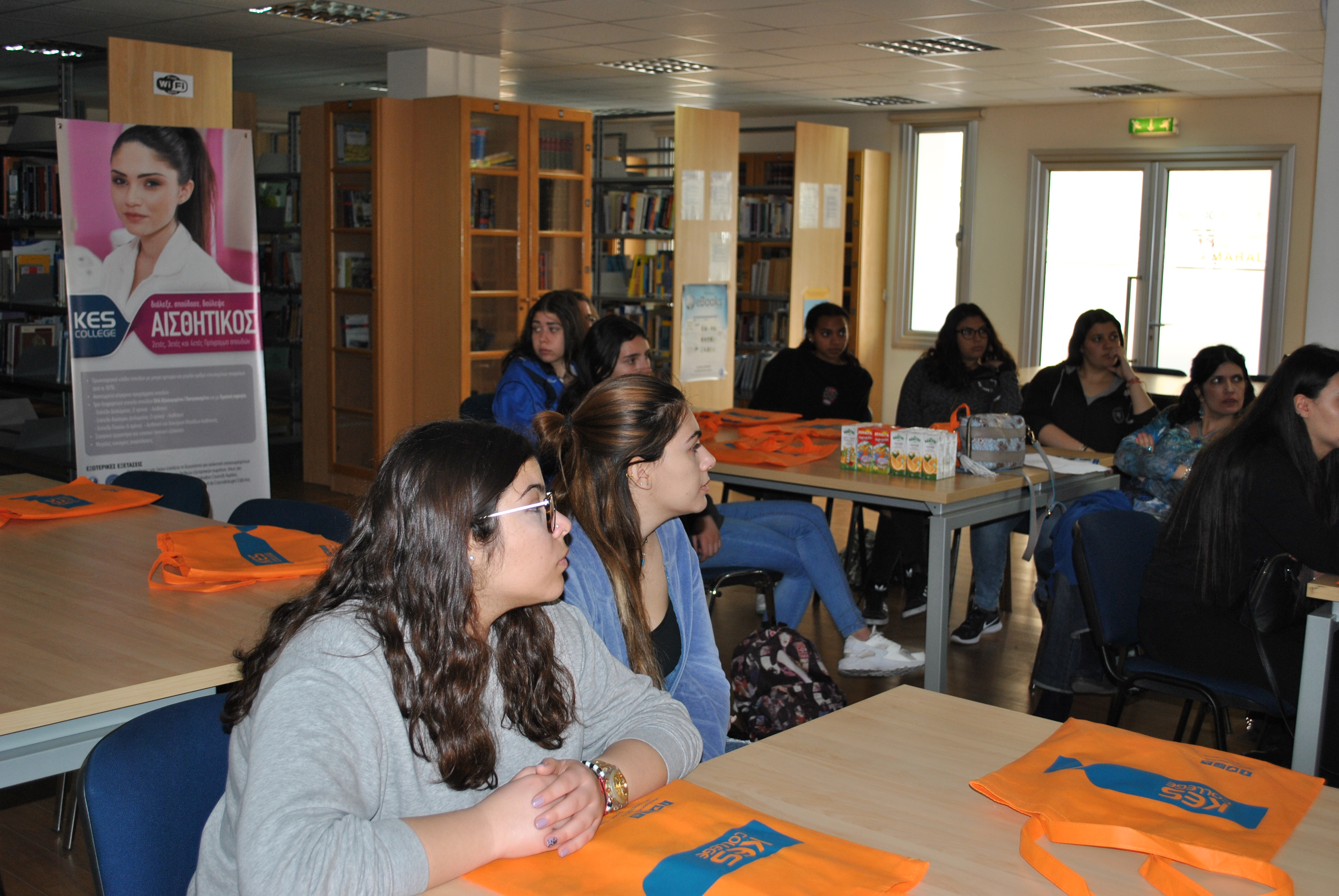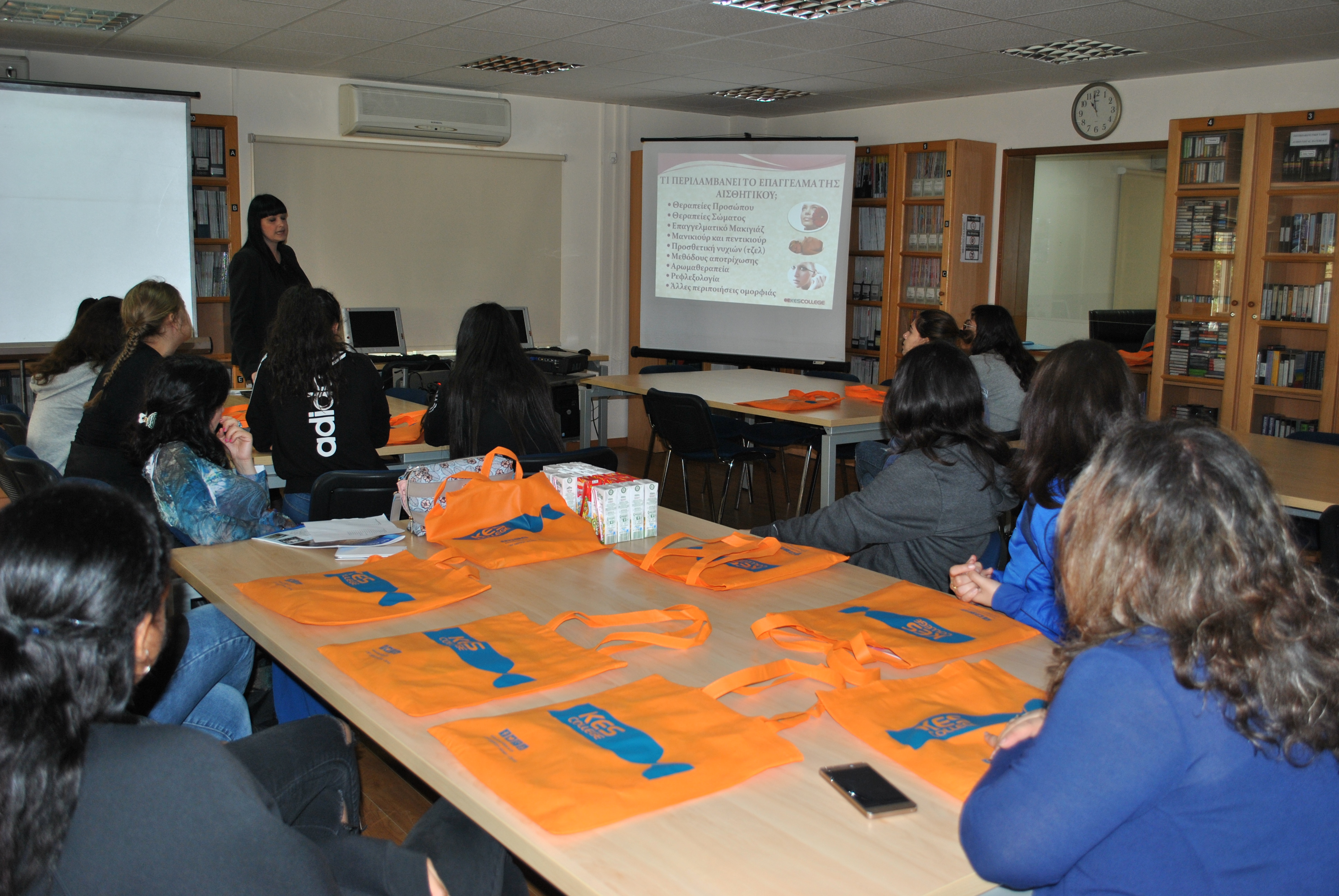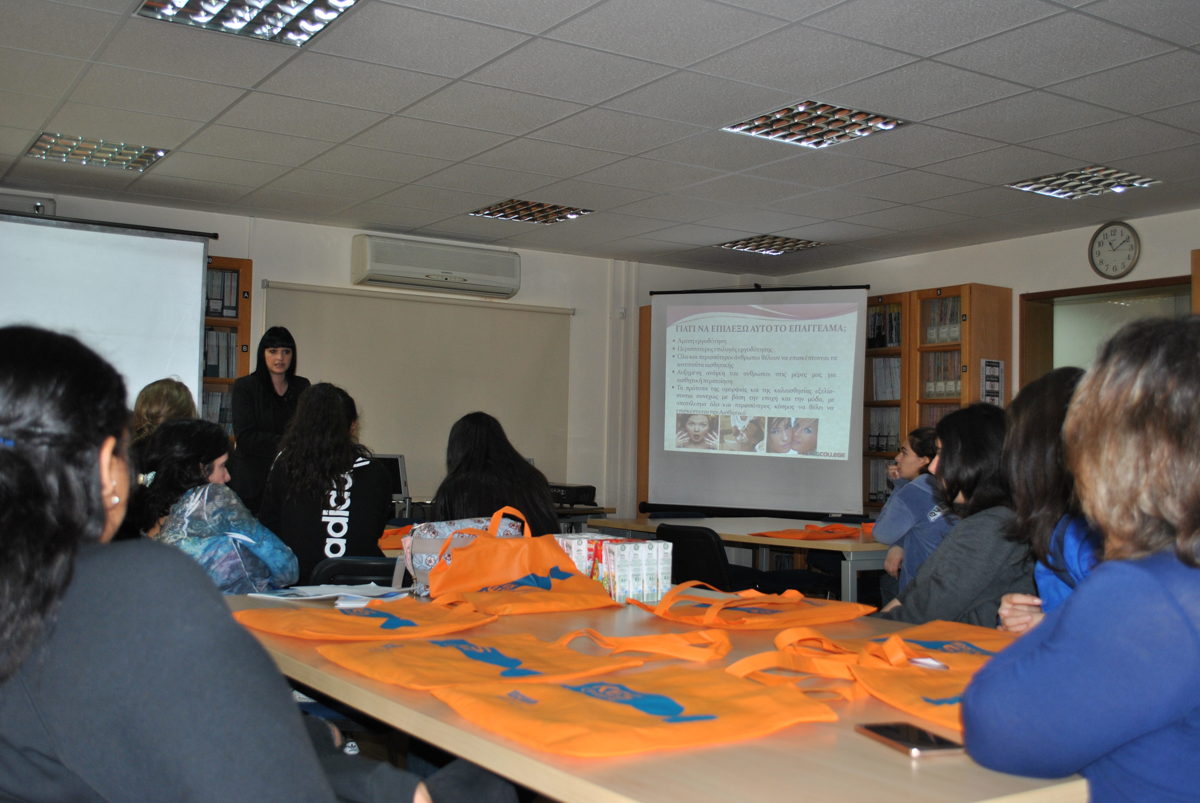 Αρχικά έγινε παρουσίαση του κολλεγίου και των Προγραμμάτων Σπουδών Αισθητικής από την κα. Μαρκέλλα Σιαρλή, υπεύθυνη των Προγραμμάτων Σπουδών Αισθητικής Τριετούς και Τετραετούς Φοίτησης, στη βιβλιοθήκη του κολλεγίου. Οι μαθήτριες ενημερώθηκαν λεπτομερώς για ότι αφορά τις σπουδές Αισθητικής, τις προοπτικές επαγγελματικής αποκατάστασης αλλά και για τις παροχές του κολλεγίου, τις δραστηριότητες και τους διαγωνισμούς στους οποίους συμμετέχει και τις φιλανθρωπικές εκδηλώσεις που στηρίζει.