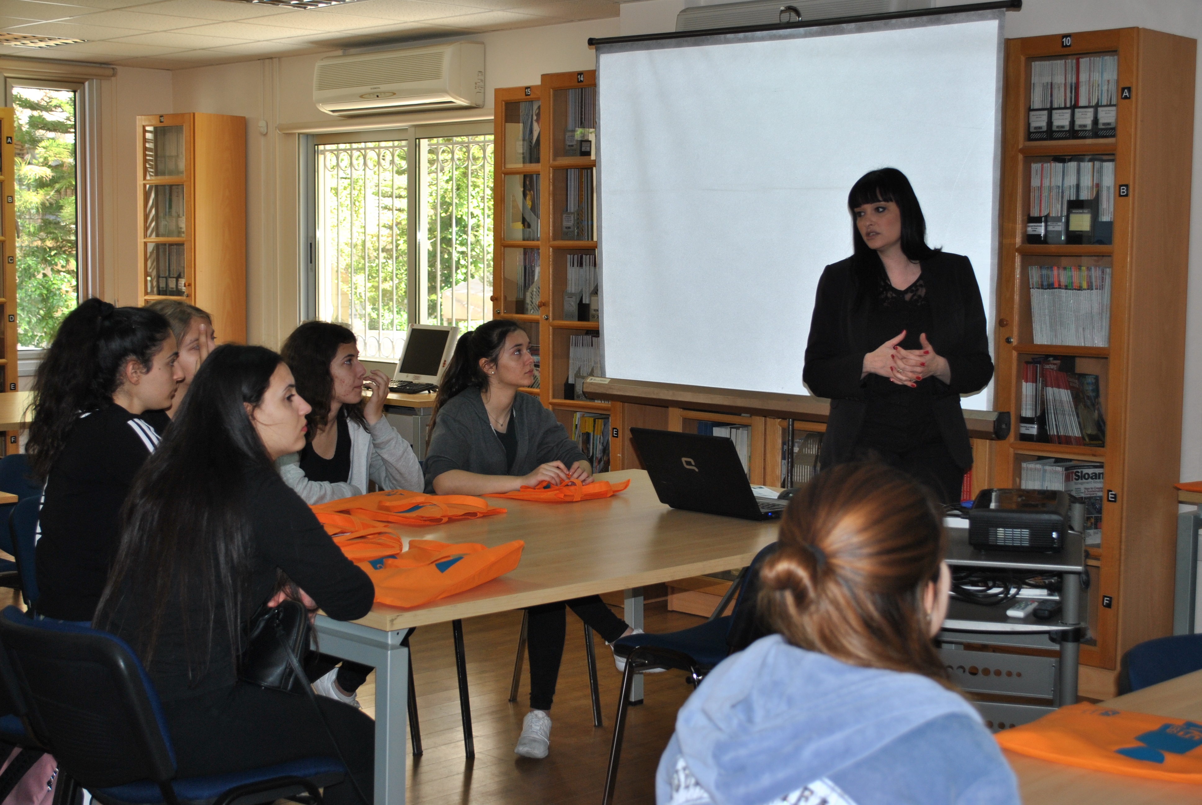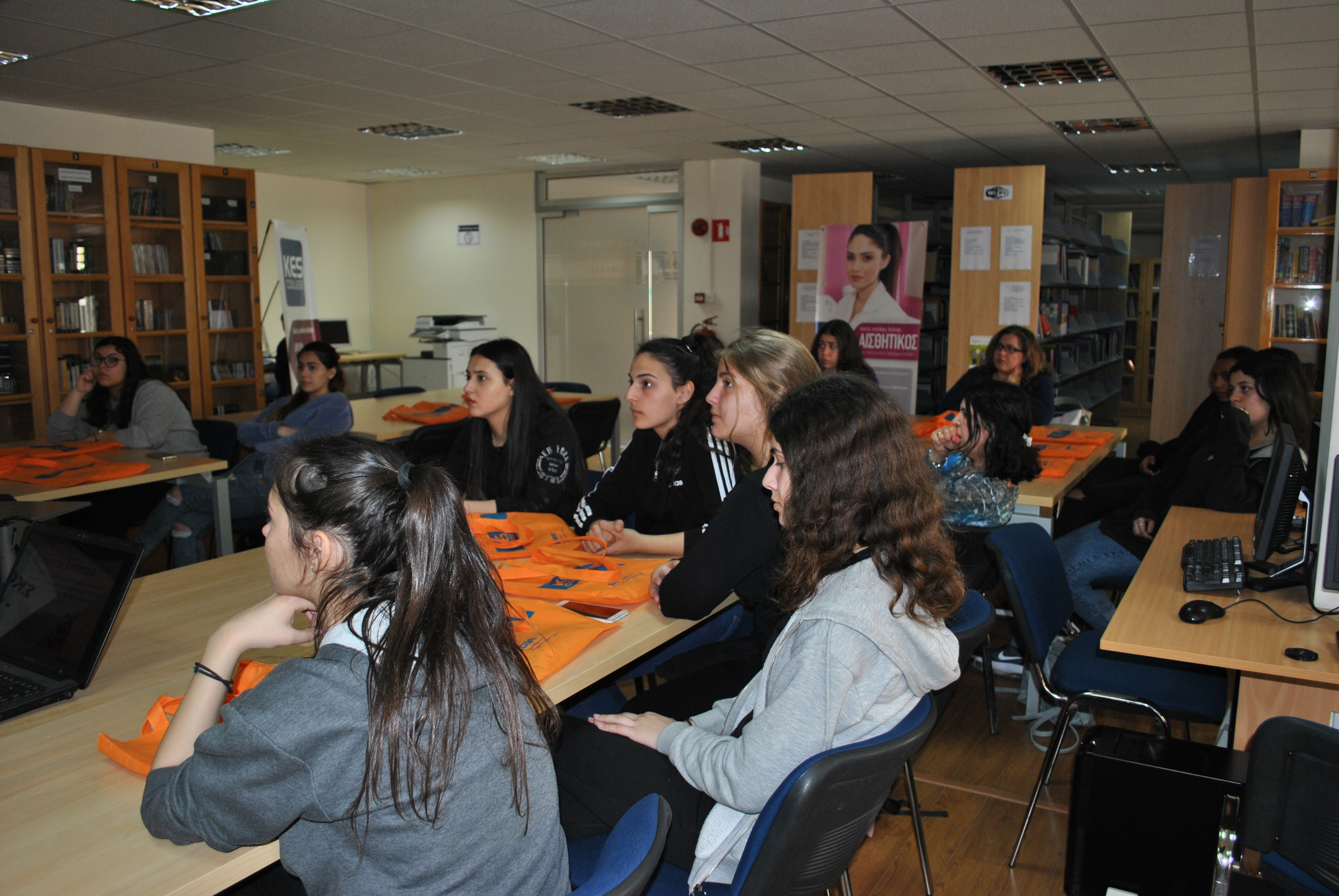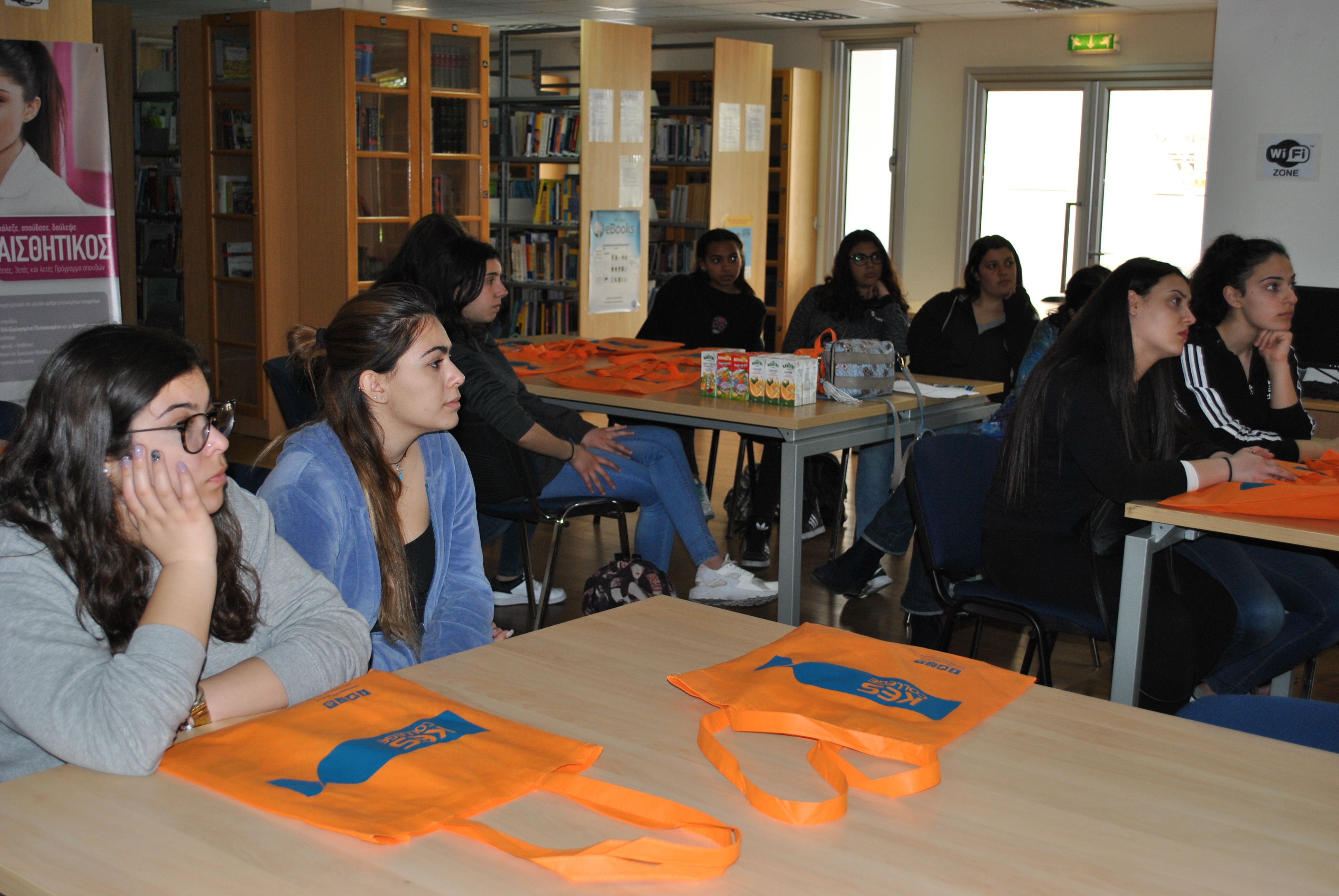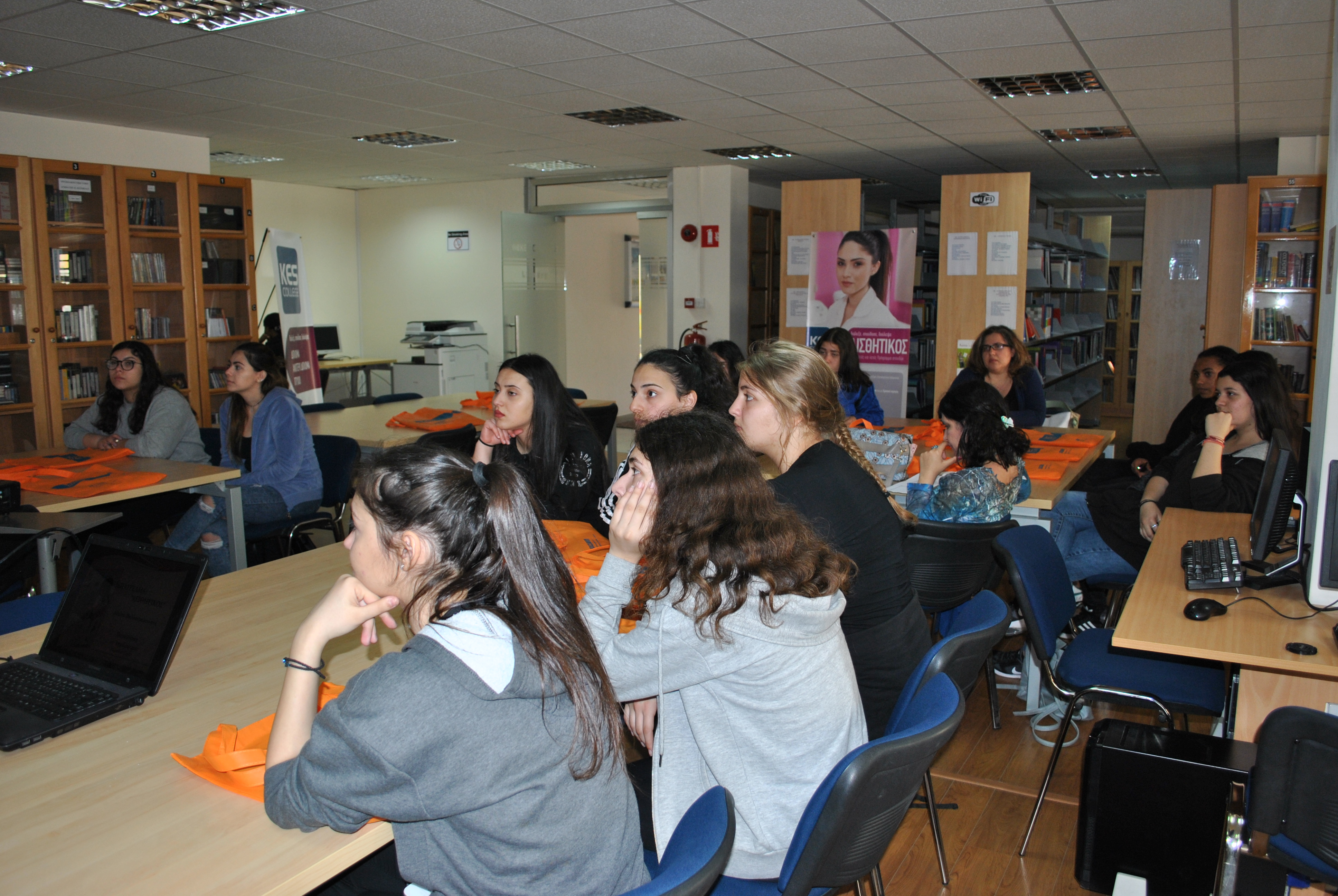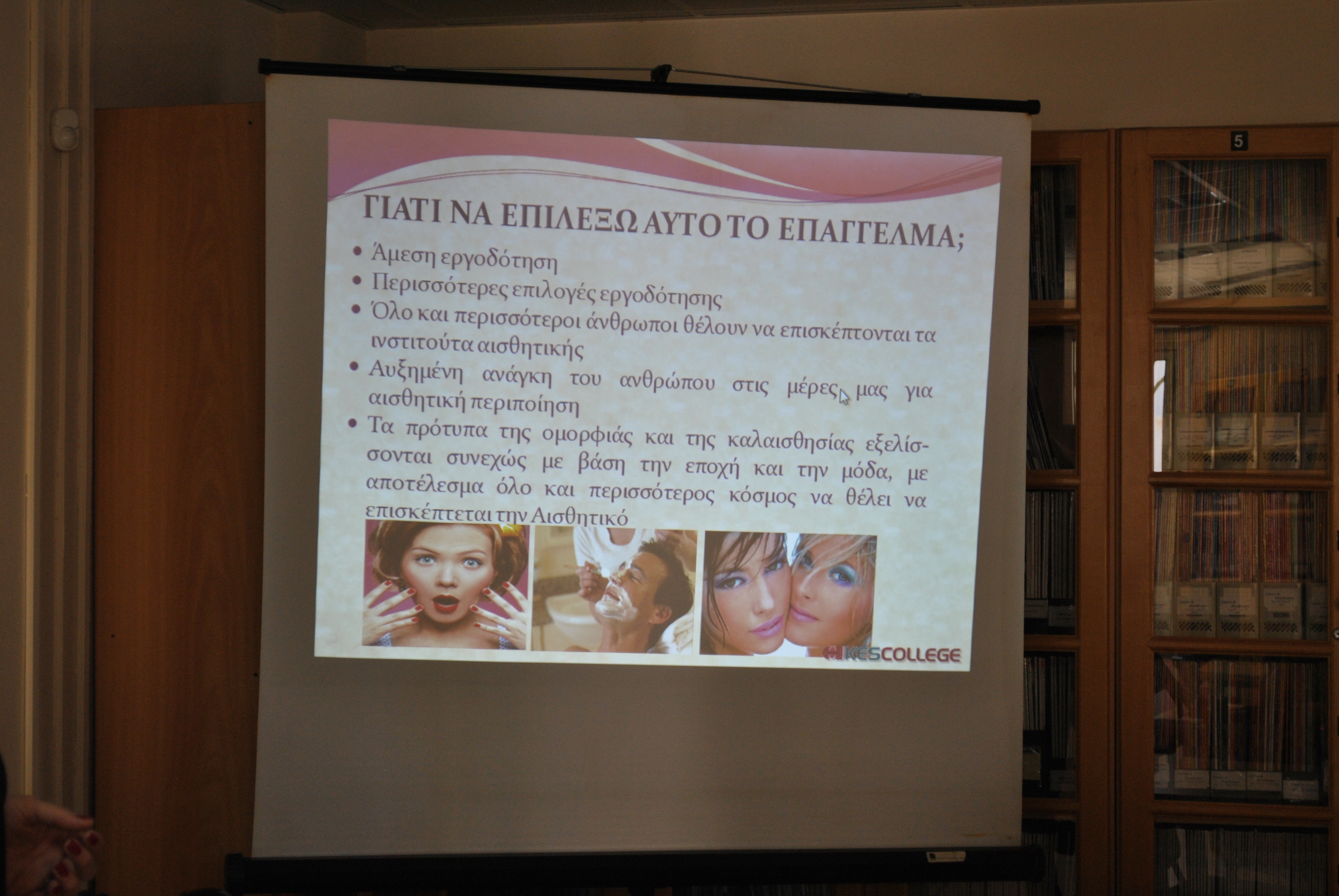 Αρχικά έγινε παρουσίαση του κολλεγίου και των Προγραμμάτων Σπουδών Αισθητικής από την κα. Μαρκέλλα Σιαρλή, υπεύθυνη των Προγραμμάτων Σπουδών Αισθητικής Τριετούς και Τετραετούς Φοίτησης, στη βιβλιοθήκη του κολλεγίου. Οι μαθήτριες ενημερώθηκαν λεπτομερώς για ότι αφορά τις σπουδές Αισθητικής, τις προοπτικές επαγγελματικής αποκατάστασης αλλά και για τις παροχές του κολλεγίου, τις δραστηριότητες και τους διαγωνισμούς στους οποίους συμμετέχει και τις φιλανθρωπικές εκδηλώσεις που στηρίζει.