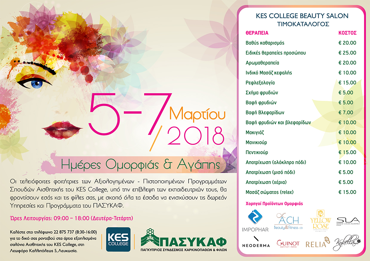 Από τη Δευτέρα, 5 Μαρτίου έως και την Τετάρτη 7 Μαρτίου, οι τελειόφοιτες φοιτήτριες των Αξιολογημένων – Πιστοποιημένων Προγραμμάτων Σπουδών Αισθητικής του KES College, υπό την επίβλεψη των εκπαιδευτριών τους, θα φροντίσουν εσάς και τις φίλες σας και OΛΑ ΤΑ EΣΟΔΑ θα δοθούν στον ΠΑΣΥΚΑΦ για να ενισχύσουν τις δωρεάν Υπηρεσίες και Προγράμματά του.