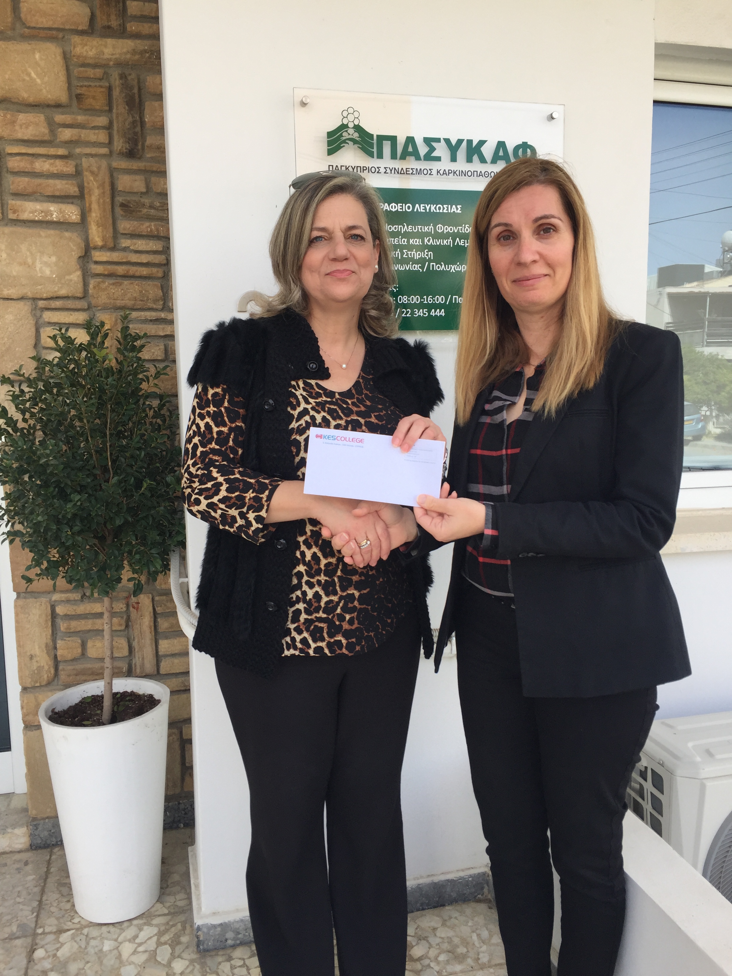 Η τελετή παράδοσης της επιταγής πραγματοποιήθηκε τη Δευτέρα, 19 Μαρτίου 2018 στις εγκαταστάσεις του ΠΑΣΥΚΑΦ κατά την οποία η κα. Χρύσω Χαχολιάδου, Αναπληρωτής Γενική Διευθύντρια του KES College, παρέδωσε την επιταγή στη Βοηθό Γενική Διευθύντρια του ΠΑΣΥΚΑΦ κα. Σόφη Χριστοφόρου, η οποία εκ μέρους του Συνδέσμου ευχαρίστησε θερμά το KES College γι’ αυτήν του την πρωτοβουλία.