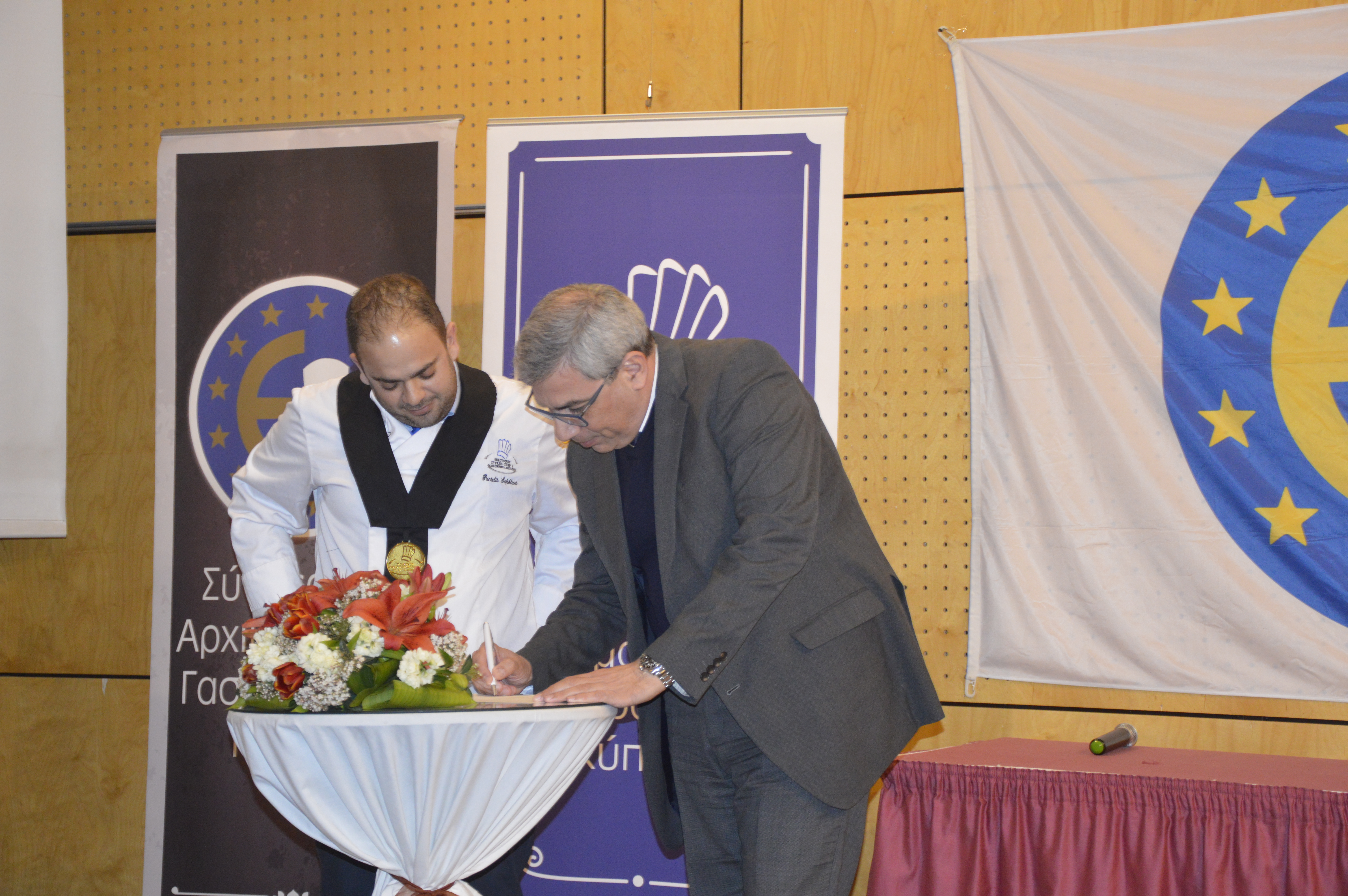 Τέλος, ο κ. Παντελής Σοφοκλέους εκ μέρους του Συνδέσμου Αρχιμαγείρων / Γαστρονόμων Κύπρου – Eurotoques υπέγραψε Μνημόνιο Αδελφοποίησης (Twinning Charter) με τον κ. Πέτρο Στυλιανού εκ μέρους του KES College.