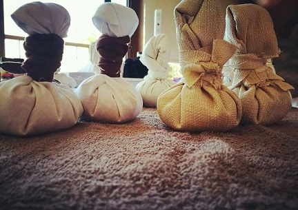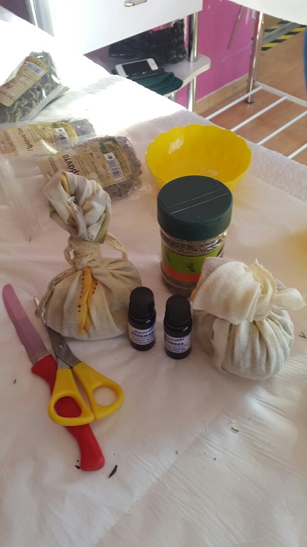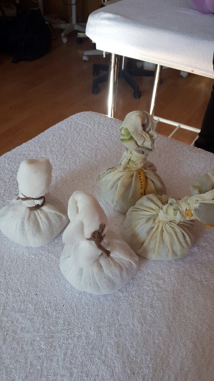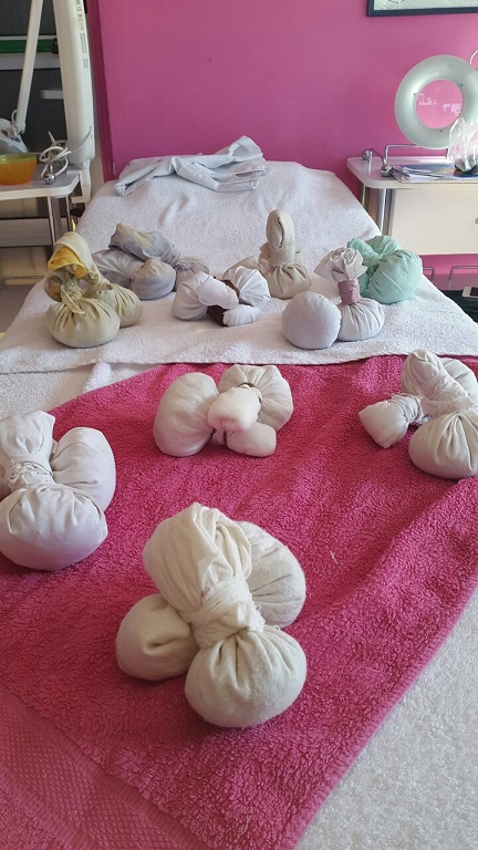 Πριν την εφαρμογή της θεραπείας οι φοιτήτριες, βασισμένες στις θεωρητικές τους γνώσεις αλλά και με την καθοδήγηση της εκπαιδεύτριάς τους, κατασκεύασαν Θεραπευτικά Πουγκιά από Βότανα ανάλογα με το πρόβλημα που αντιμετώπιζε το μοντέλο τους. Στην συνέχεια τα μοντέλα είχαν την ευκαιρία να απολαύσουν μασάζ με την χρήση των Πουγκιών αλλά και Αρωματικών Αιθέριων Ελαιών, τα οποία έχουν επίσης θεραπευτικά αποτελέσματα στον ανθρώπινο οργανισμό.