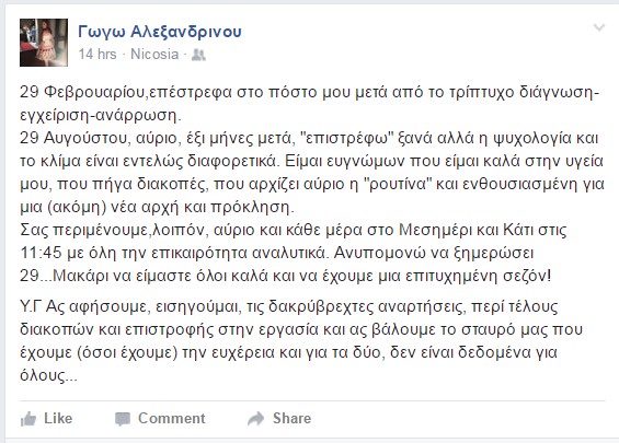 Πρεμιέρα σήμερα, 29 Αυγούστου για την εκπομπή του ΣΙΓΜΑ “Μεσημέρι και Κάτι” με τη Γωγώ Αλεξανδρινού και η ίδια χθες βράδυ με ένα συγκινητικό post στην προσωπική της σελίδα στο facebook έγραψε για τη νέα αυτή τηλεοπτική της πρόκληση αλλά και για την περιπέτεια που είχε με την υγεία της και που την έκανε να αναθεωρήσει πολλά πράγματα στη ζωή της. Διαβάστε στο συγκινητικό της post: