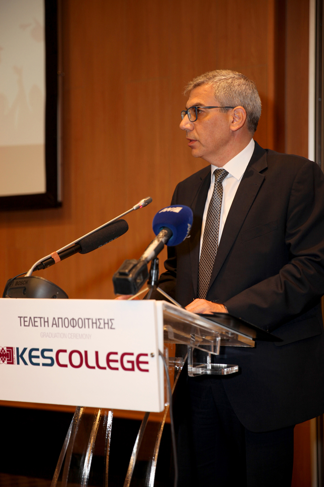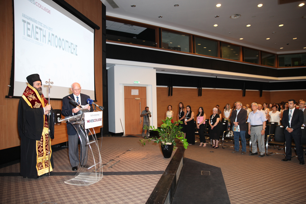 Στην έναρξη της Τελετής, ο Πανιερώτατος Μητροπολίτης Κυρηνείας κ.κ. Χρυσόστομος τέλεσε δέηση και απηύθυνε τις ευχές του προς τους τελειόφοιτους. Στη συνέχεια, ο Αναπληρωτής Διευθυντής του KES College, κ. Πέτρος Στυλιανού έκανε ένα σύντομο απολογισμό των πεπραγμένων της Ακαδημαϊκής Χρονιάς 2016-2017 και αναφέρθηκε στα σαράντα έξι χρόνια εξελικτικής πορείας του KES College και στα 22 Αξιολογημένα-Πιστοποιημένα Προγράμματα Σπουδών που διαθέτει πλέον το κολλέγιο. «Αξιοσημείωτο είναι το γεγονός ότι ο αριθμός των φοιτητών που φοίτησαν κατά το Ακαδημαϊκό Έτος 2016-2017, αυξήθηκε κατά 14,6% σε σύγκριση με το προηγούμενο ακαδημαϊκό έτος, γεγονός που επιβεβαιώνει τη συνεχόμενη αύξηση της εμπιστοσύνης του κόσμου προς το ποιοτικό επίπεδο του κολλεγίου», ανέφερε ο κ. Στυλιανού. Στο τέλος, συνεχάρη θερμά όλους τους αποφοίτους και τους ευχήθηκε καλή σταδιοδρομία.