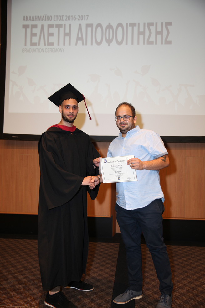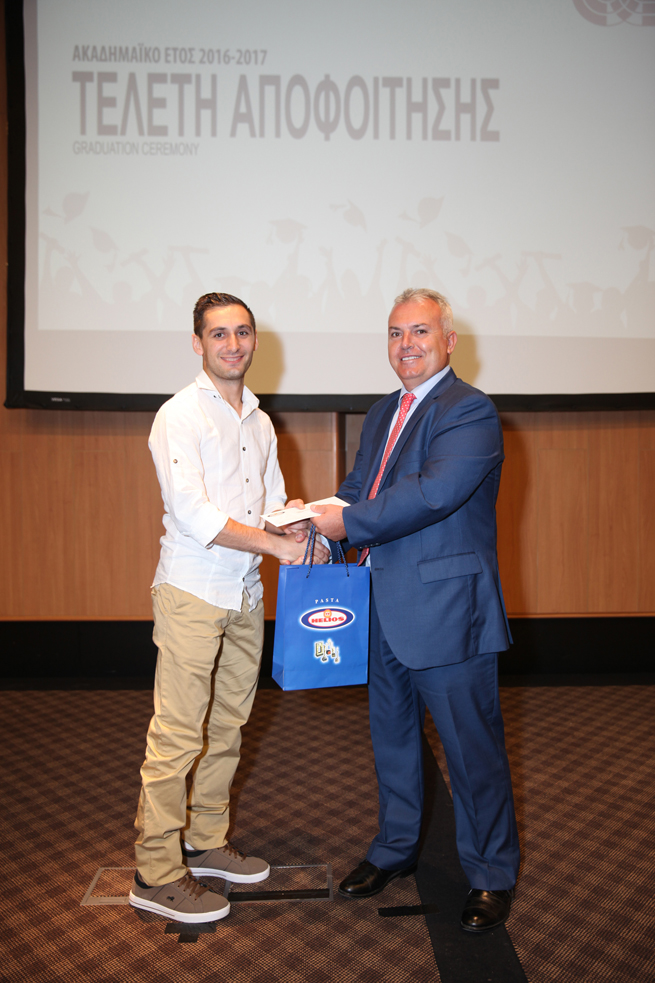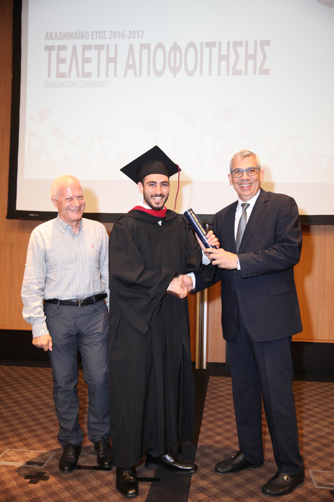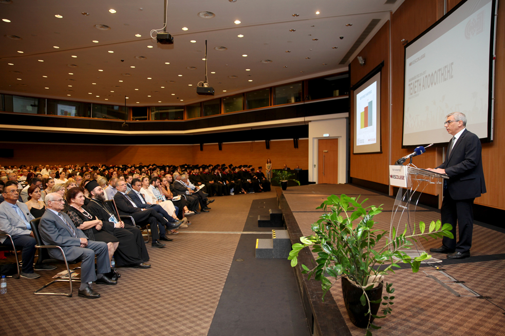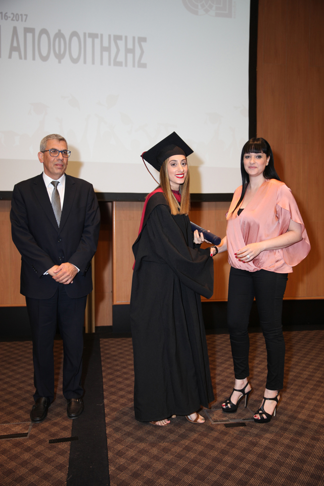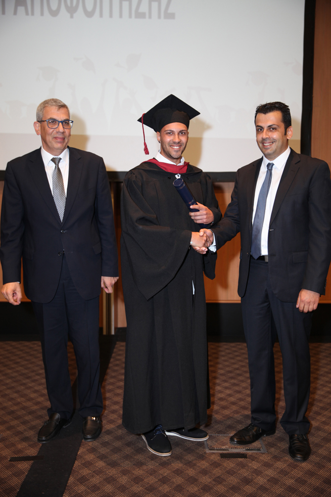 Ακολούθησε η απονομή βραβείων σε τελειόφοιτους με την υψηλότερη βαθμολογία από εκπροσώπους διαφόρων εταιρειών και οργανισμών και η απονομή τίτλων σπουδών από τον κ. Στυλιανού και τους Συντονιστές των Προγραμμάτων Σπουδών. Η εκδήλωση κορυφώθηκε με το πέταγμα των καπέλων και τις στιγμές χαράς και συγκίνησης μεταξύ των τελειόφοιτων αλλά και των συγγενών και φίλων.