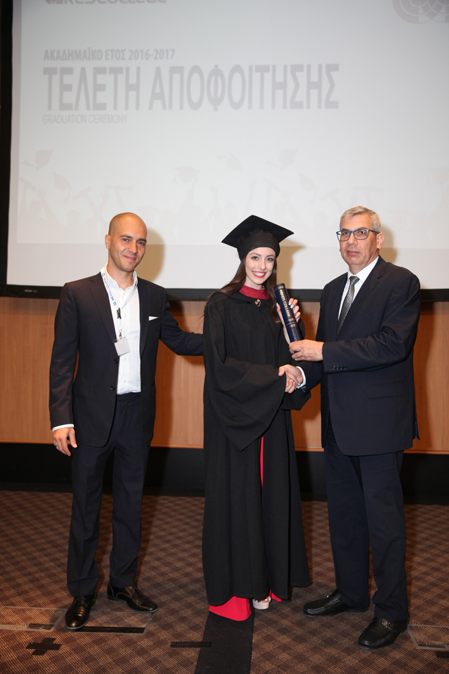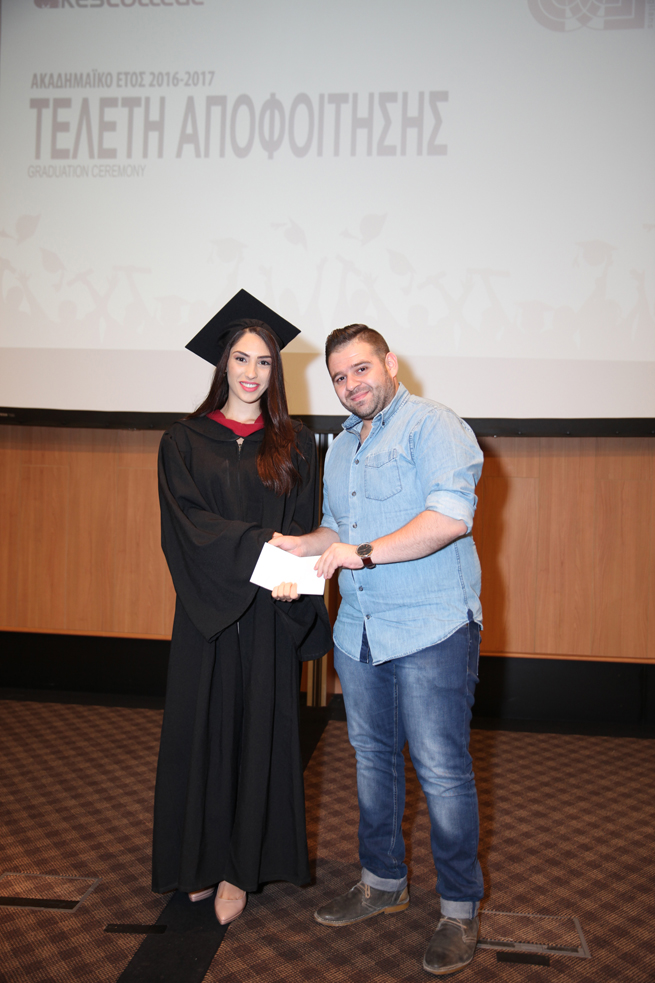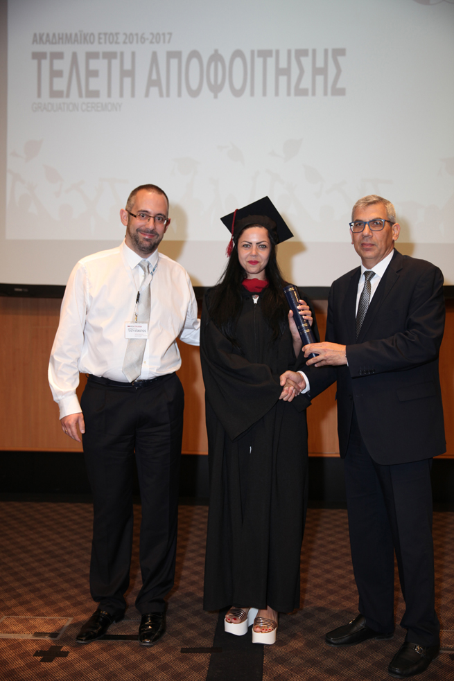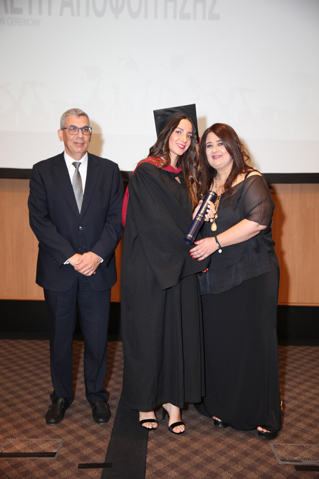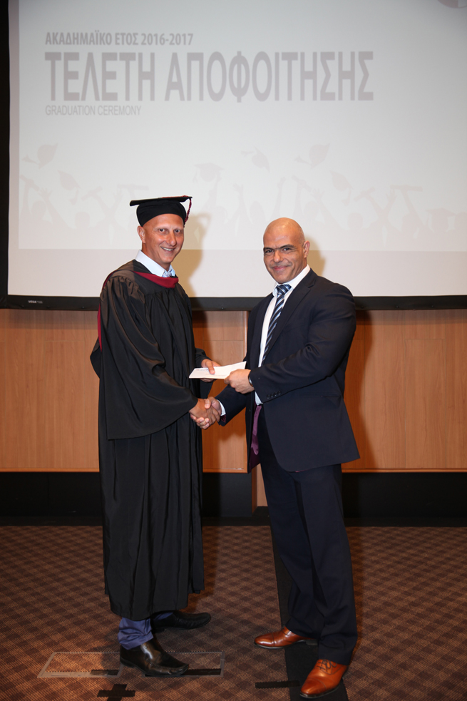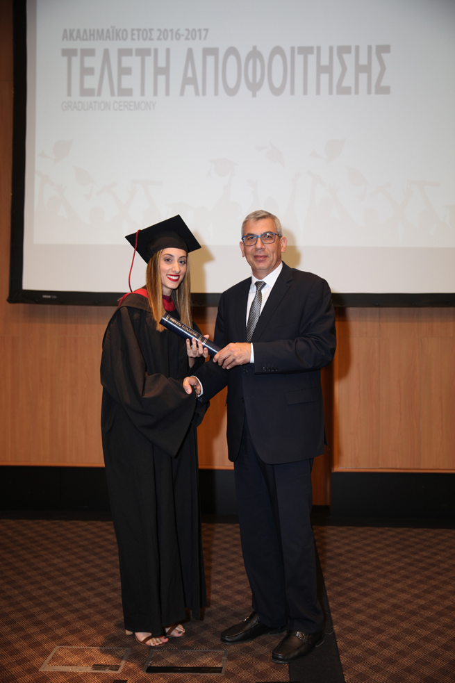 Ακολούθησε η απονομή βραβείων σε τελειόφοιτους με την υψηλότερη βαθμολογία από εκπροσώπους διαφόρων εταιρειών και οργανισμών και η απονομή τίτλων σπουδών από τον κ. Στυλιανού και τους Συντονιστές των Προγραμμάτων Σπουδών. Η εκδήλωση κορυφώθηκε με το πέταγμα των καπέλων και τις στιγμές χαράς και συγκίνησης μεταξύ των τελειόφοιτων αλλά και των συγγενών και φίλων.