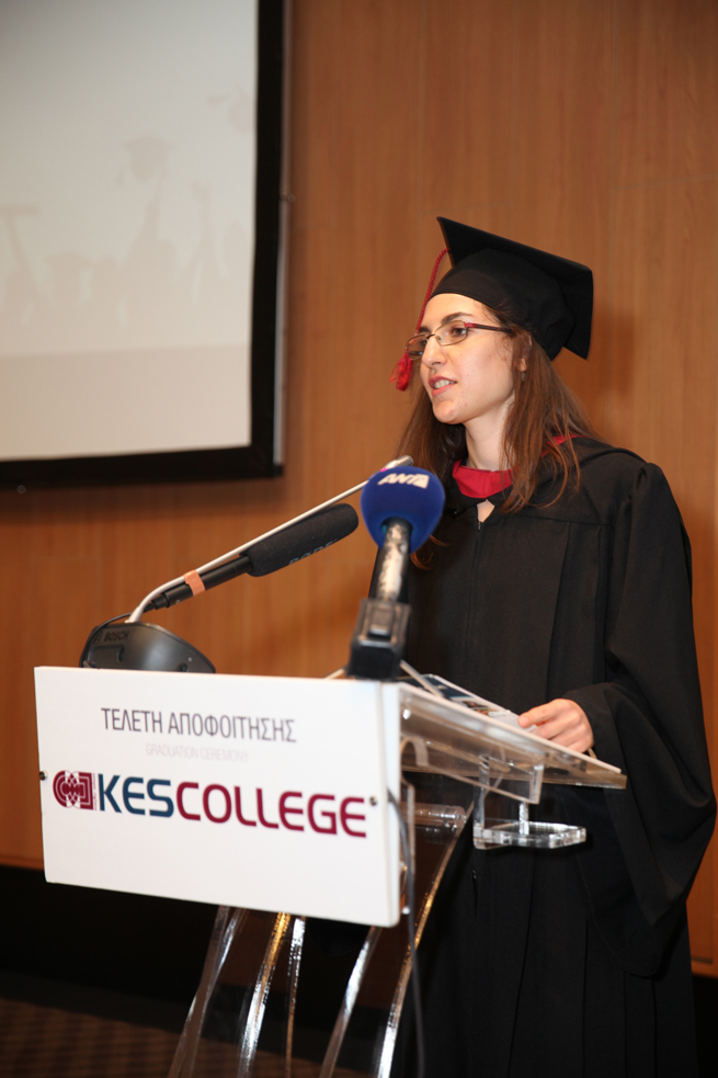 Εκ μέρους της φοιτητικής κοινότητας, σύντομο χαιρετισμό εκφώνησε η απόφοιτος με την ψηλότερη βαθμολογία κα Άννα Προική, τελειόφοιτη του Προγράμματος Σπουδών «Κηποτεχνία και Σχεδιασμός Κήπου (3 χρόνια, Ανώτερο Δίπλωμα), η οποία αφού ευχαρίστησε το διοικητικό και ακαδημαϊκό προσωπικό του KES College για τις άψογες υπηρεσίες τους, σημείωσε ότι «Η πορεία στο KES College ήταν μία διαδρομή με ποικιλία εμπειριών και γνώσεων με υπέροχους καθηγητές και συμφοιτητές και πιστεύω πως μας έχει επηρεάσει όλους προς το καλύτερο και μας έχει ανοίξει τους δρόμους για την επαγγελματική ζωή».