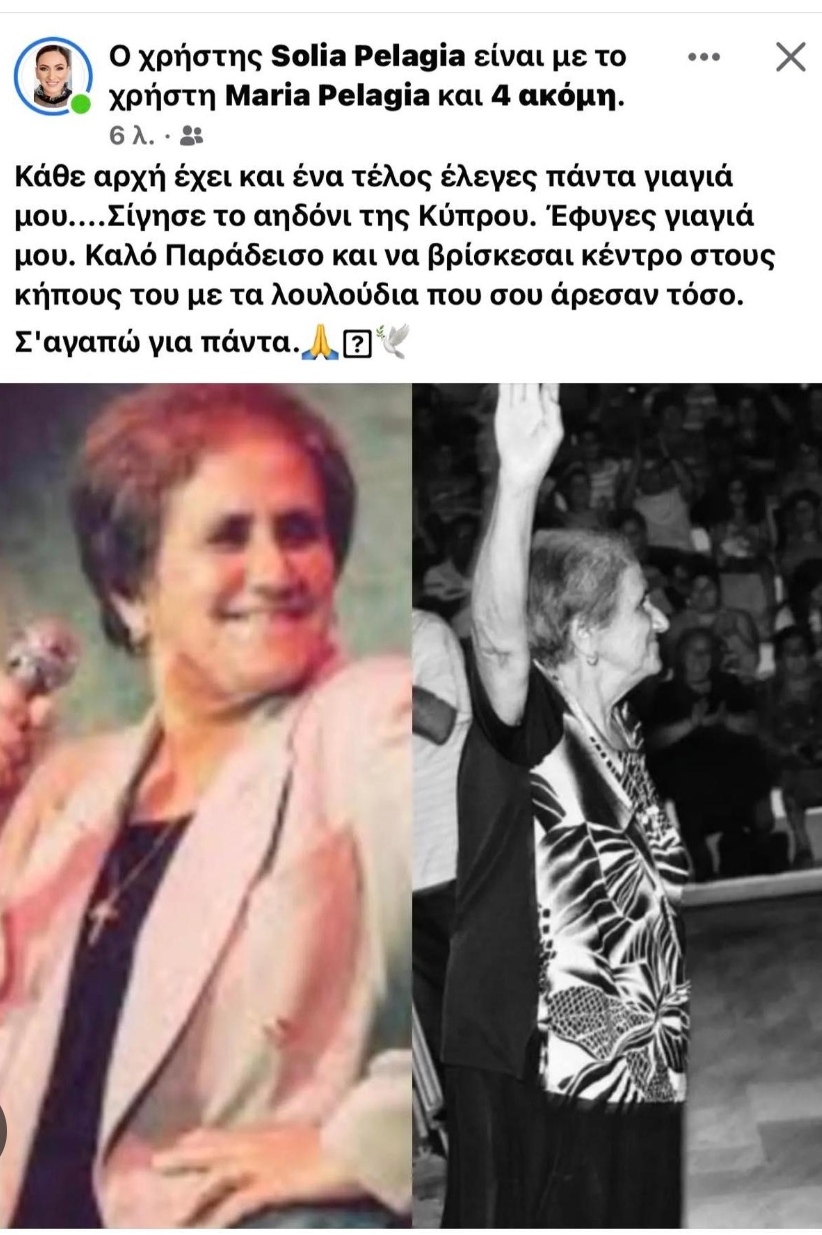 Την είδηση του θανάτου της έκανε γνωστή η εγγονή της, Σόλια Πελαγία, μέσω ανάρτησής της στο Facebook. «Σίγησε το αηδόνι της Κύπρου. Έφυγες γιαγιά μου. Καλό Παράδεισο», έγραψε.