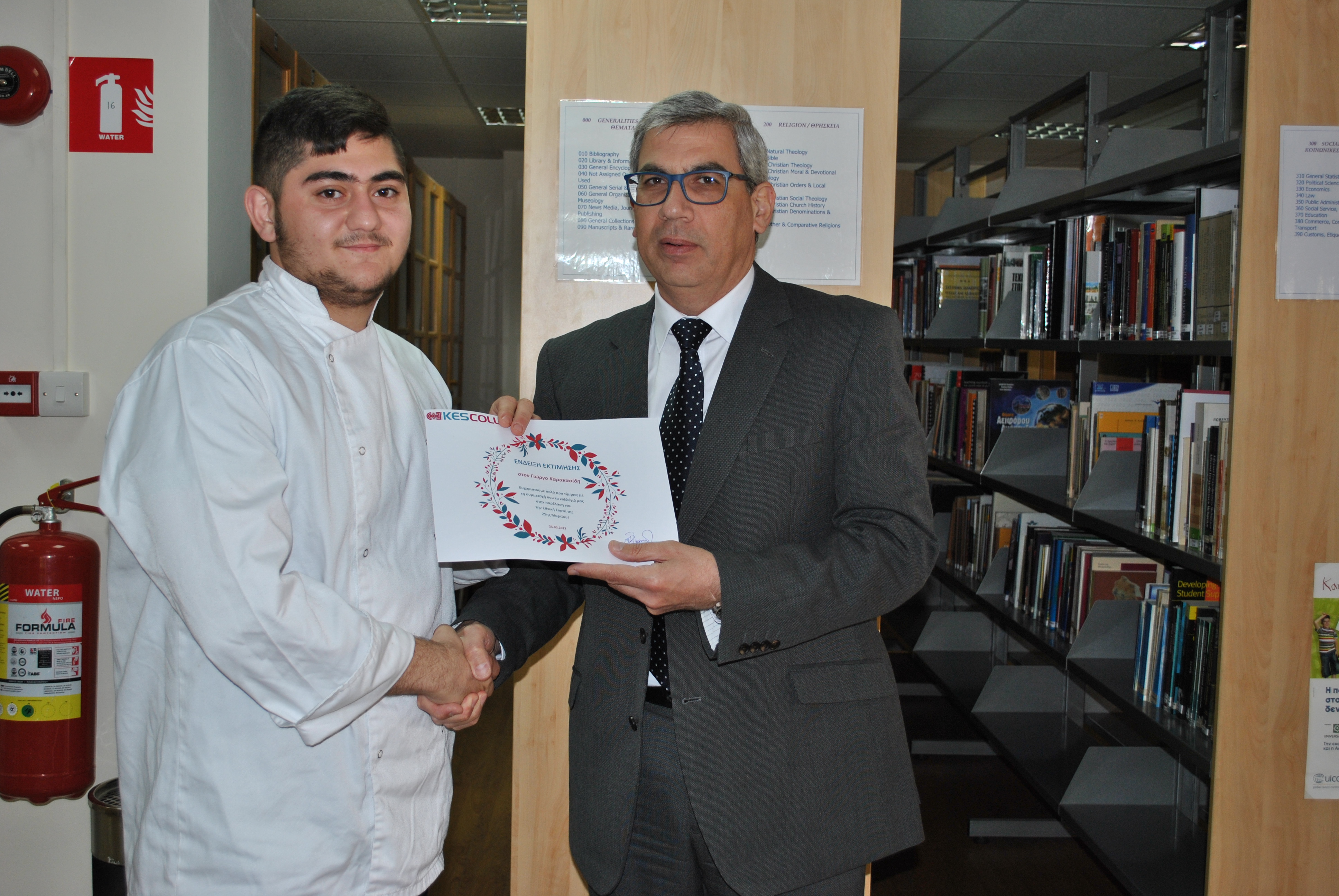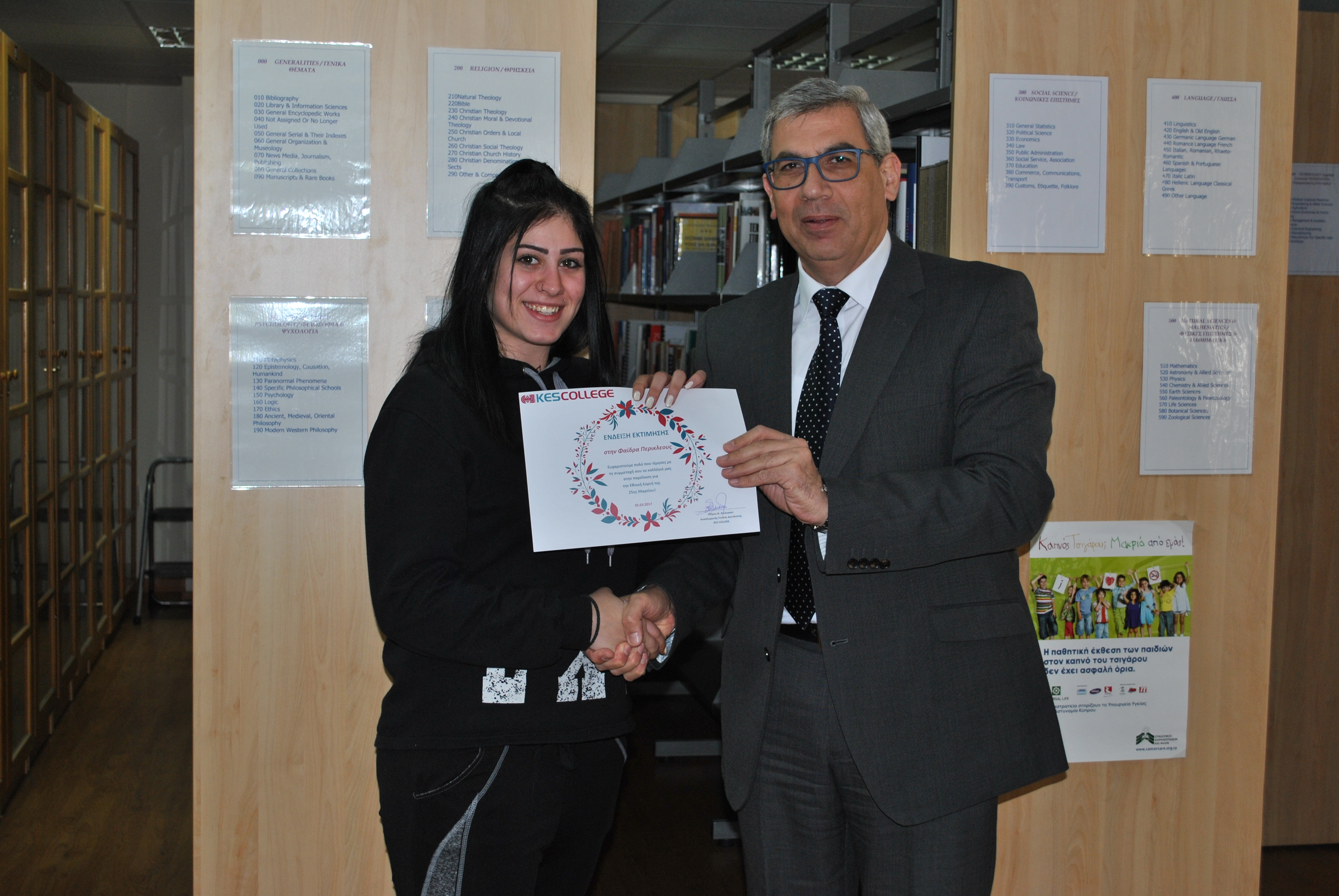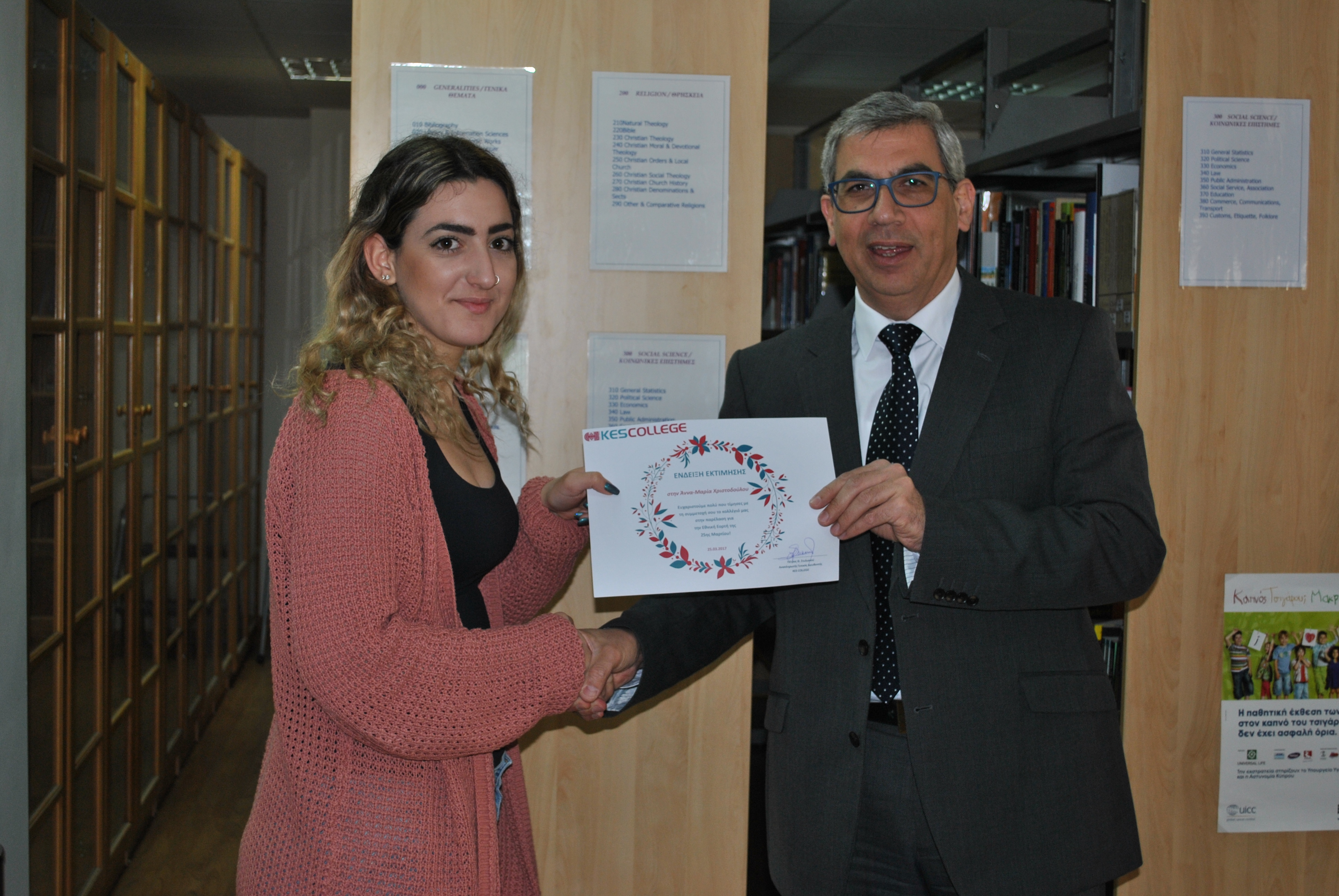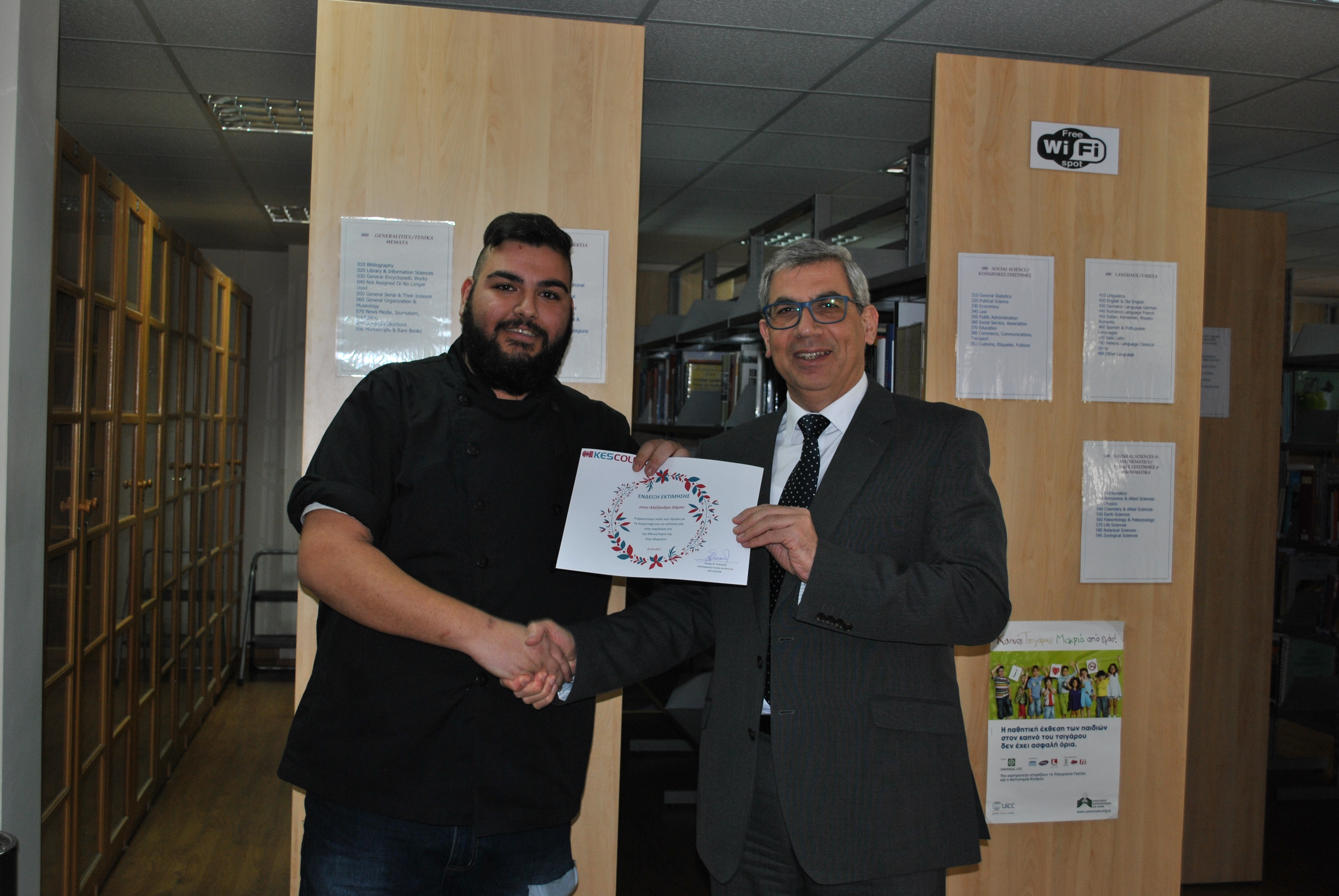 Ως ένδειξη εκτίμησης για τη συμμετοχή τους στην παρέλαση της 25ης Μαρτίου, το KES College απένειμε επαίνους στους φοιτητές σε μία μικρή εκδήλωση που πραγματοποιήθηκε στη βιβλιοθήκη το κολλεγίου την Τετάρτη, 5 Απριλίου 2017.