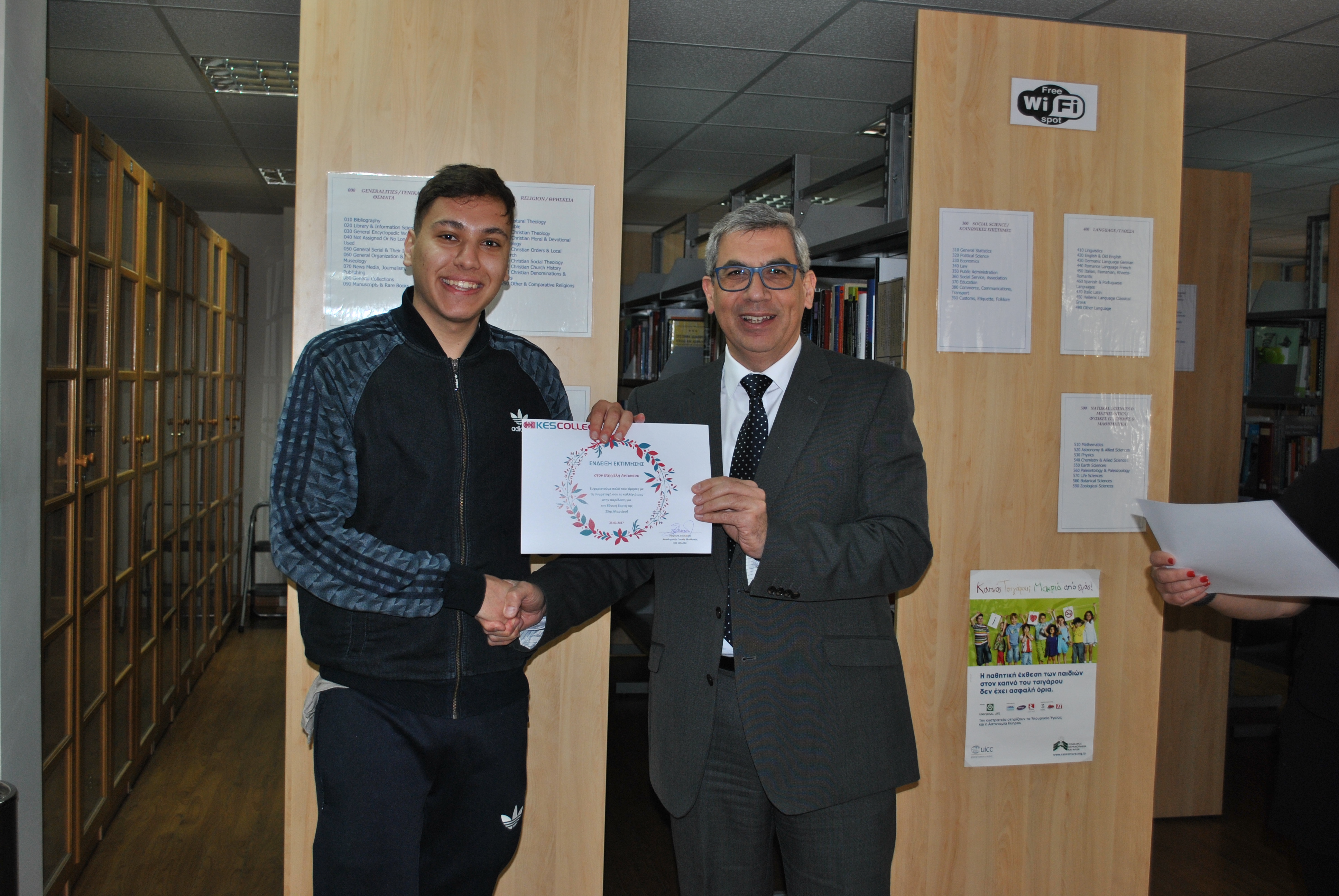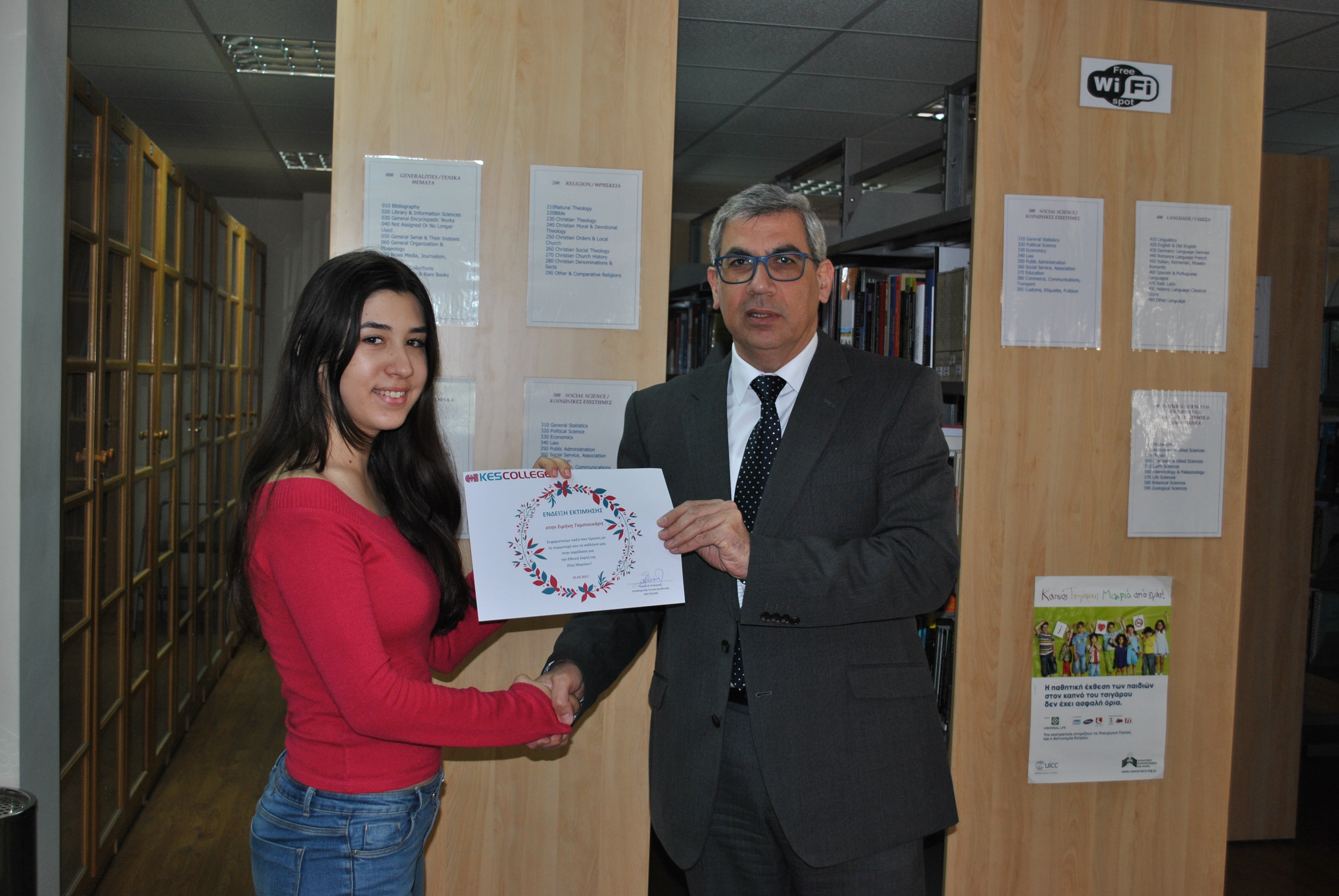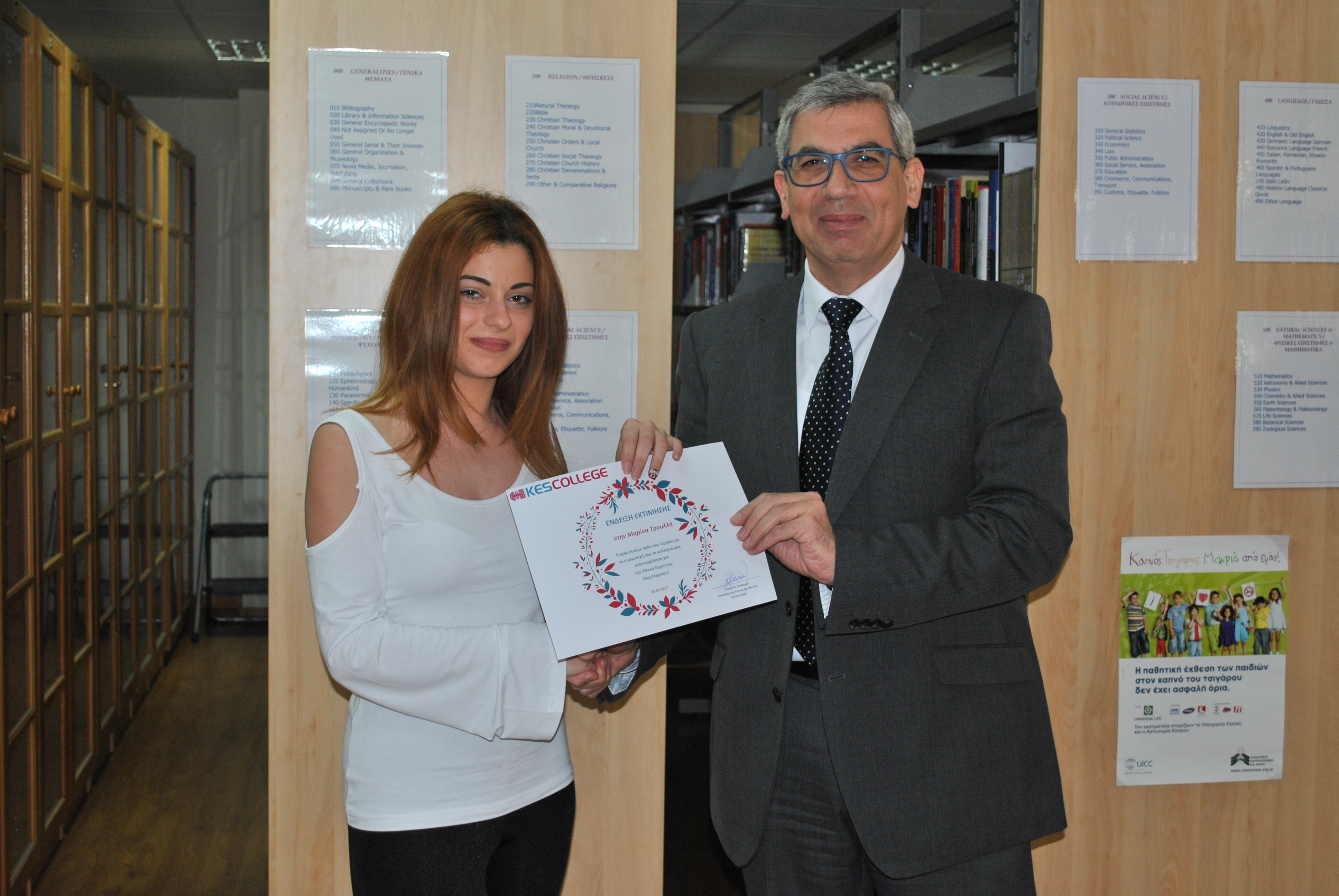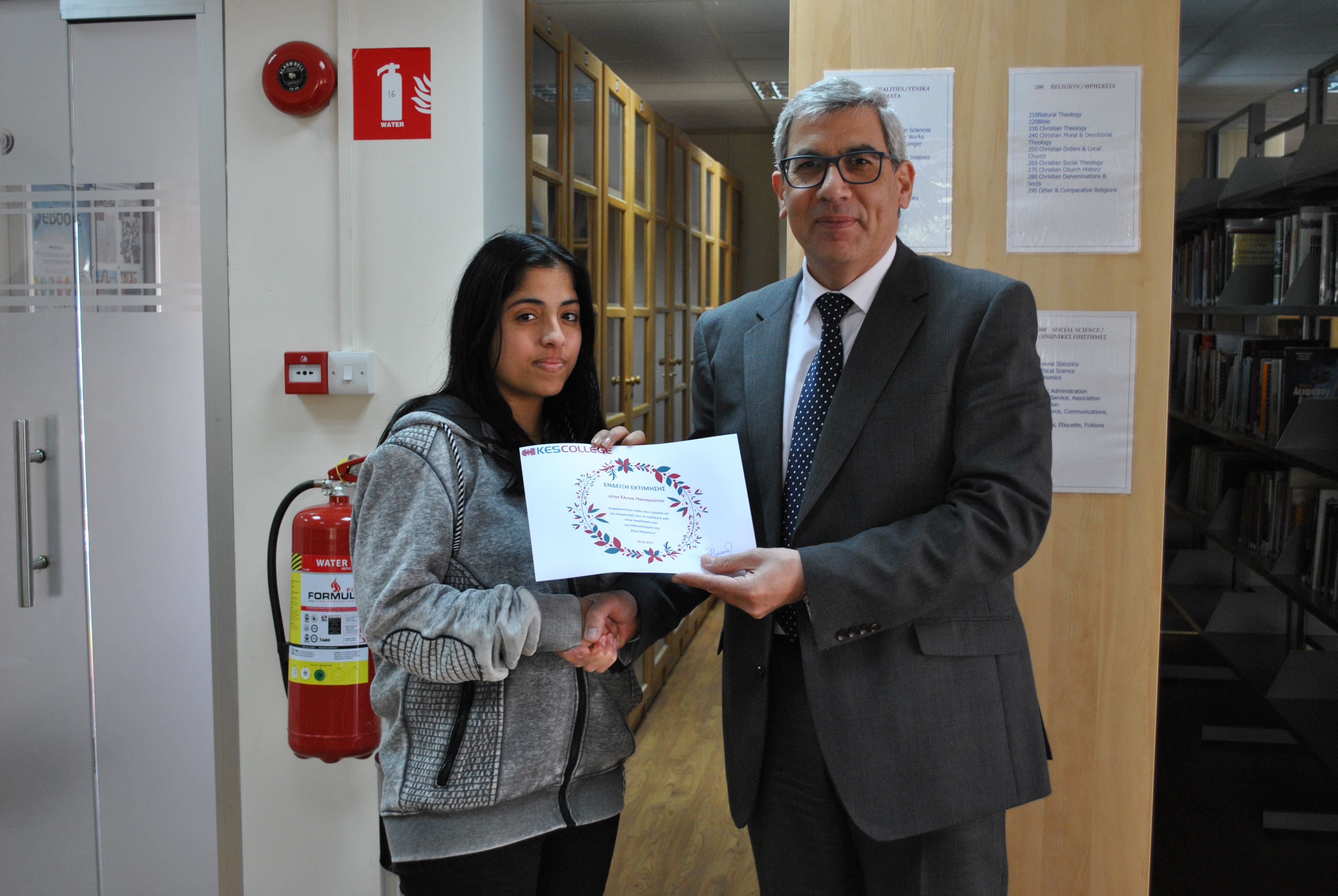 Ως ένδειξη εκτίμησης για τη συμμετοχή τους στην παρέλαση της 25ης Μαρτίου, το KES College απένειμε επαίνους στους φοιτητές σε μία μικρή εκδήλωση που πραγματοποιήθηκε στη βιβλιοθήκη το κολλεγίου την Τετάρτη, 5 Απριλίου 2017.