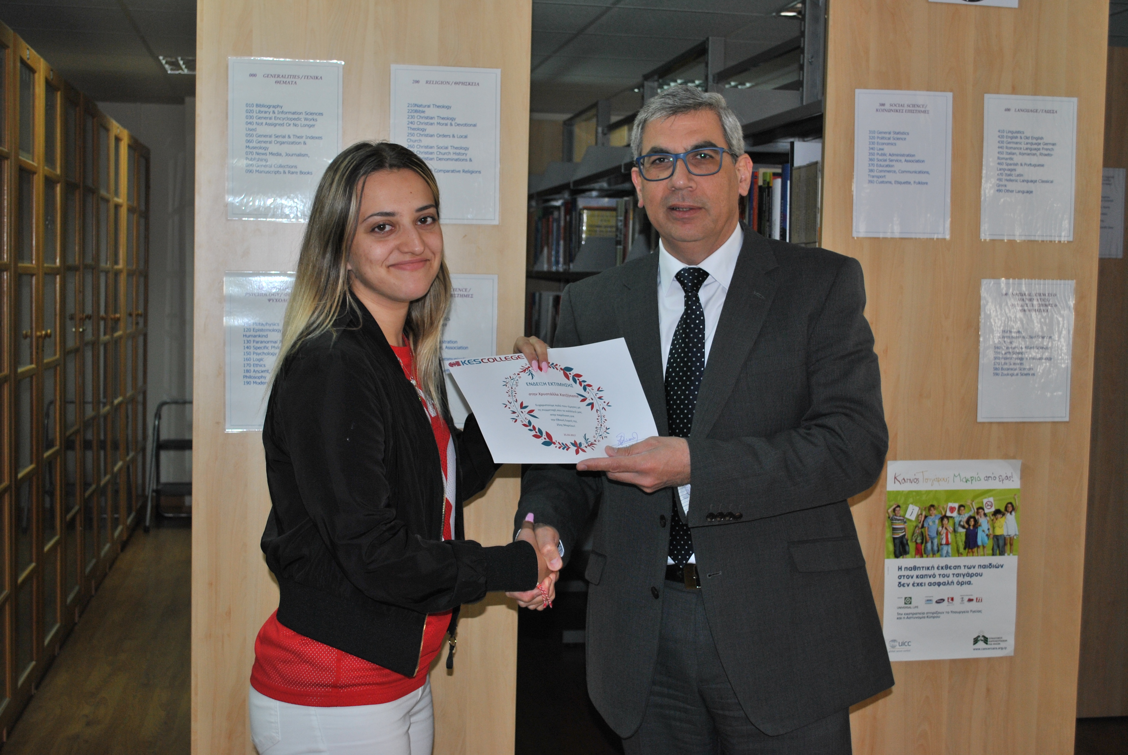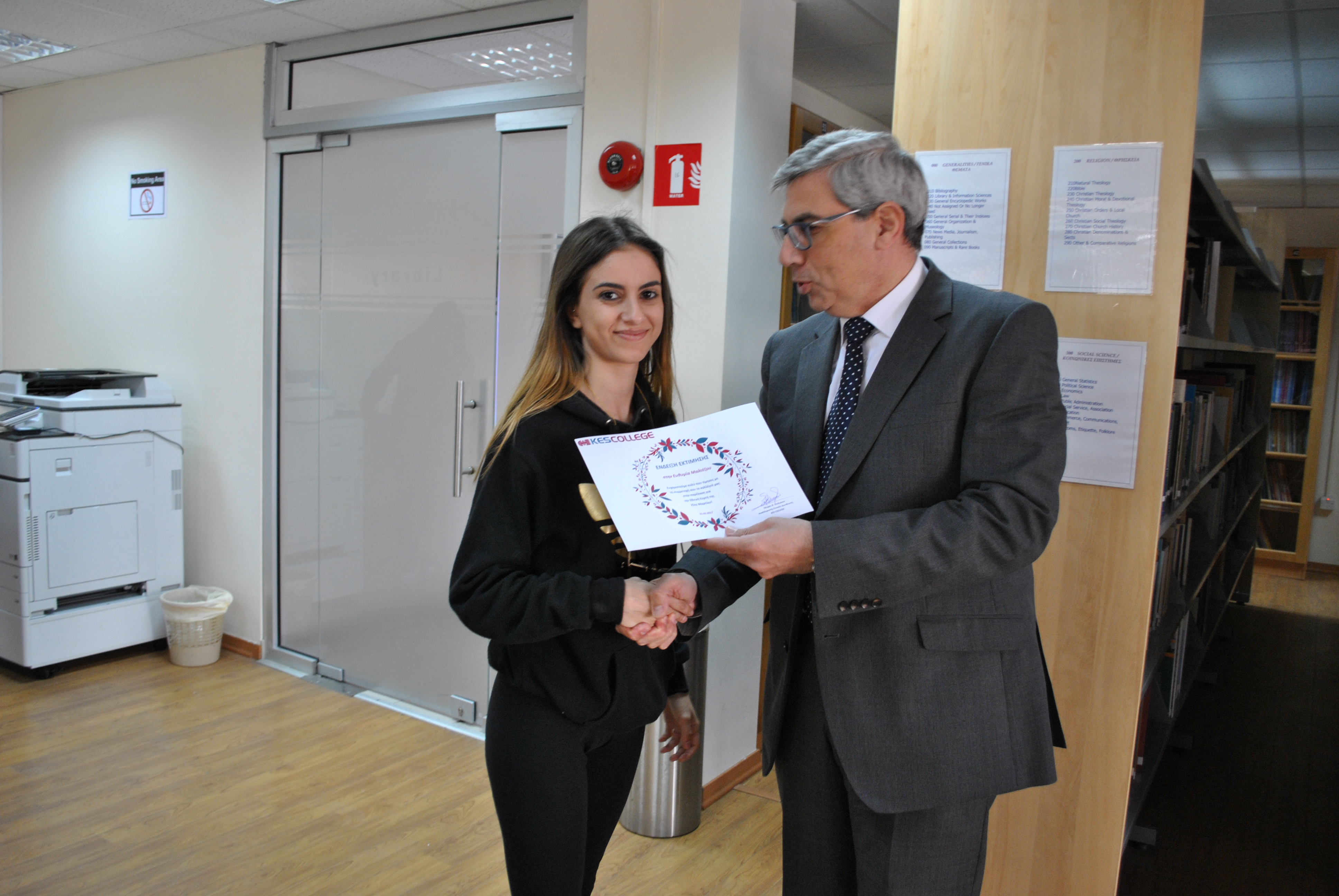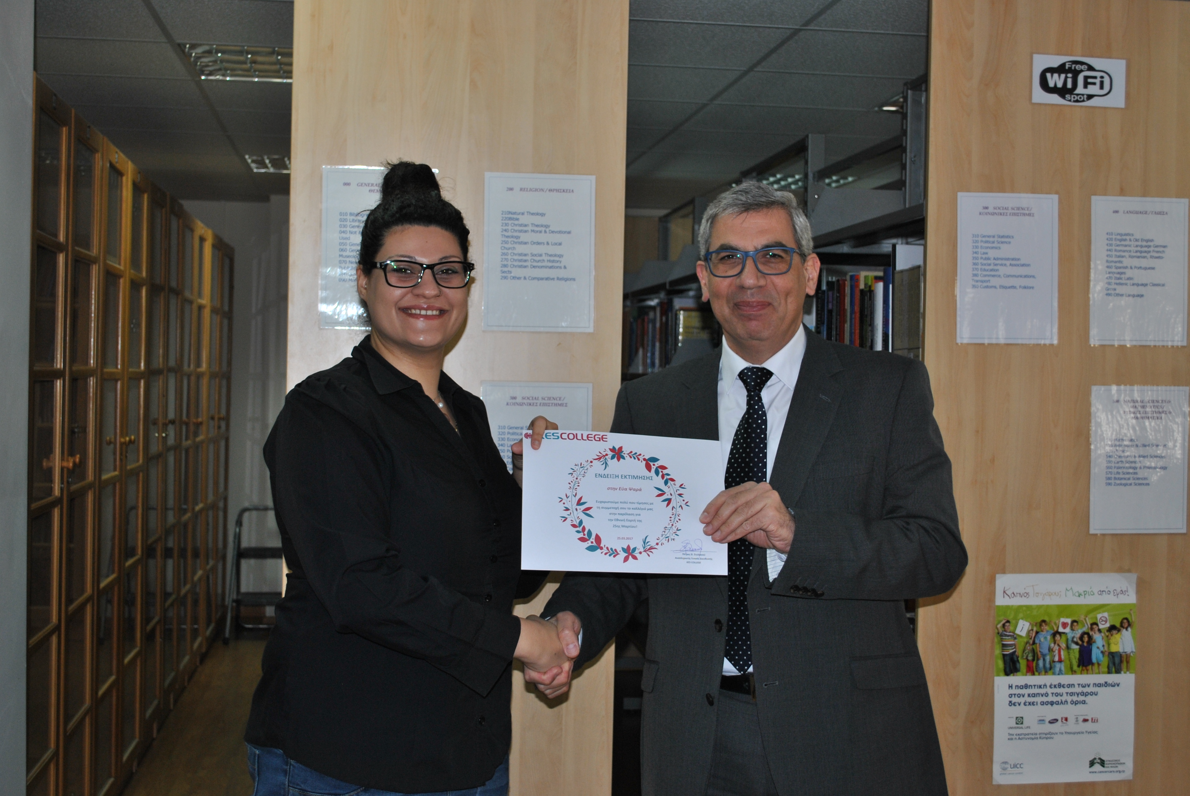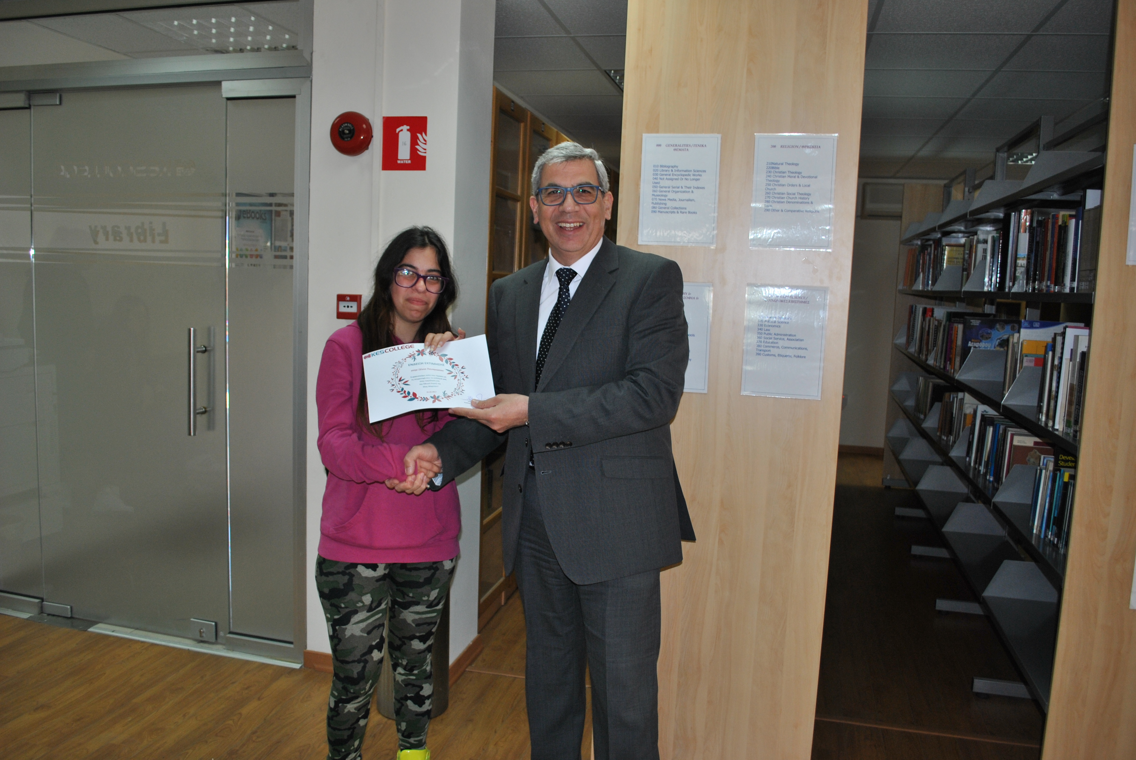 Ως ένδειξη εκτίμησης για τη συμμετοχή τους στην παρέλαση της 25ης Μαρτίου, το KES College απένειμε επαίνους στους φοιτητές σε μία μικρή εκδήλωση που πραγματοποιήθηκε στη βιβλιοθήκη το κολλεγίου την Τετάρτη, 5 Απριλίου 2017.
