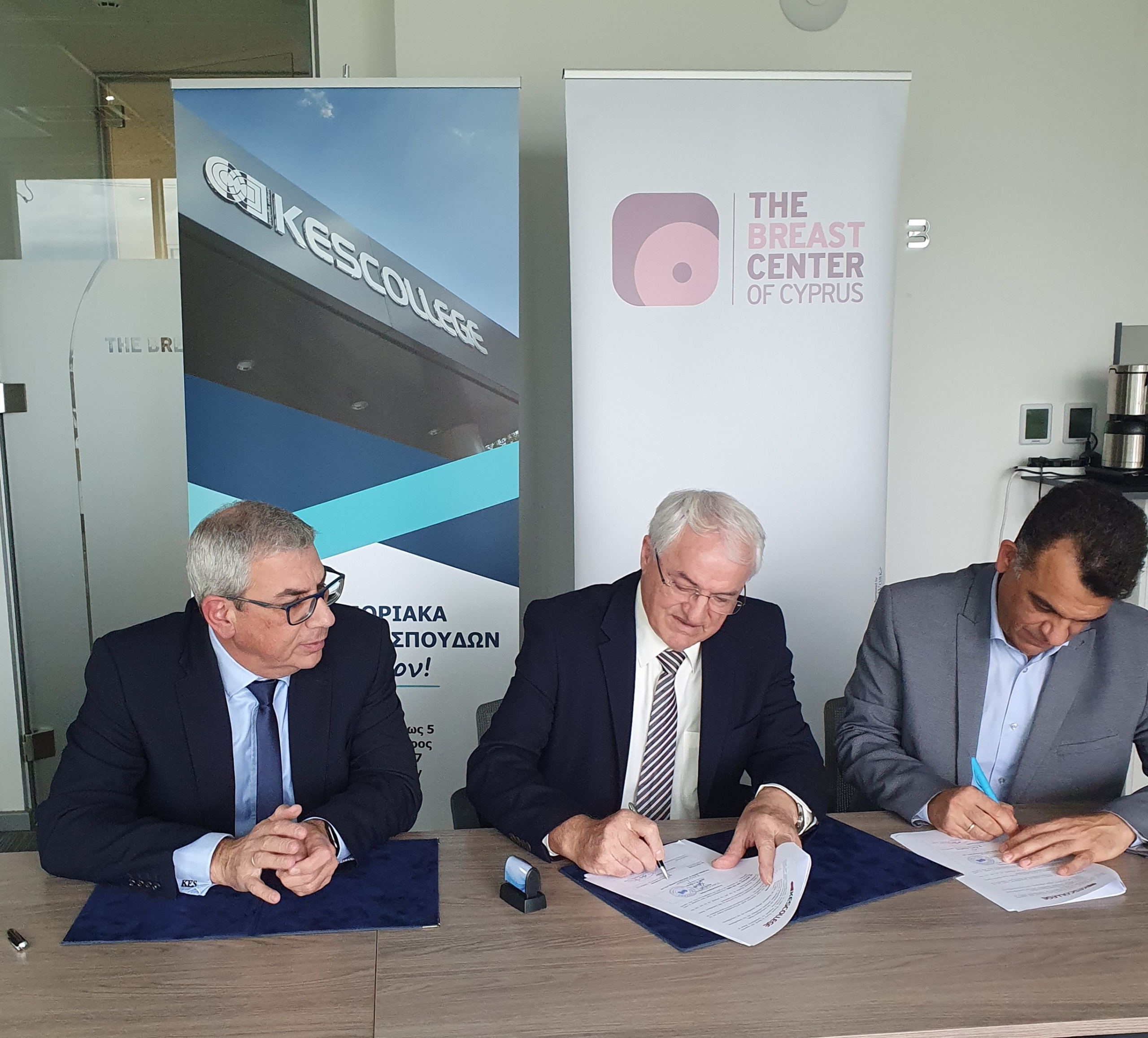 Εκ μέρους του KES College το Μνημόνιο Συνεργασίας υπέγραψε ο Γενικός Διευθυντής του, κ.Πέτρος Θ. Στυλιανού και εκ μέρους του Κέντρου Μαστού Κύπρου, υπέγραψαν ο Επιστημονικός Διευθυντής και Πρόεδρος του Δ.Σ, Δρ. Μιχάλης Θεοφάνους και ο Κλινικός Διευθυντής, Δρ. Εύρος Κιτηρής. Παρούσα ήταν η κα. Μαρκέλλα Σιαρλή, Συντονίστρια των Προγραμμάτων Σπουδών «Αισθητική» και «Αισθητική και Διαχείριση Μονάδων Αισθητικής» του KES College.